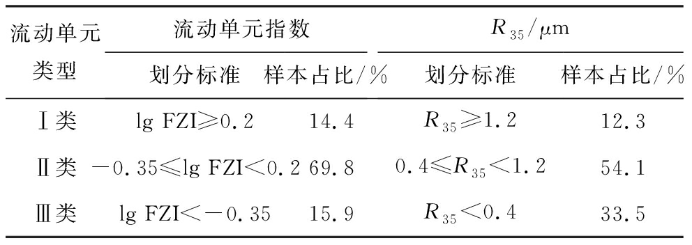 按照文献[16]中的方法,基于lg FZI和R35概率累积分布函数曲线的斜率变化特征,划分了3类流动单元,如图4和表1所示。