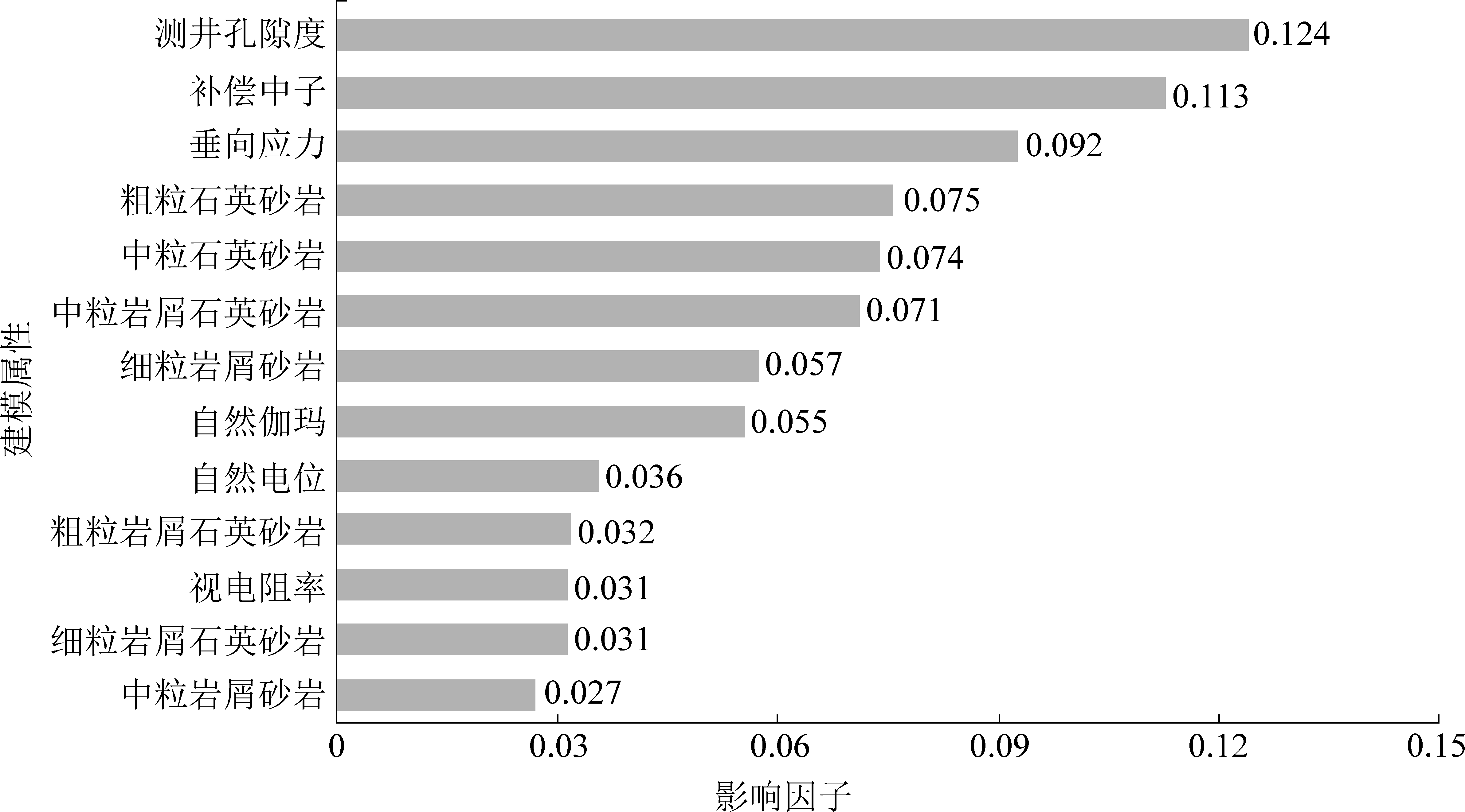 但对于流体单元的成因特征等基础地质研究来说,由于其采用的地质语言均为类别型,如不同类型砂岩的形成年代、岩石相、沉积微相、成岩相等,很难转换为数值型数据加以量化表征,深度学习、支持向量机等数值类机器学习算法无法处理。能够对上述信息进行处理的只有朴素贝叶斯、决策树和以其为基础的梯度提升树、随机森林等集成学习模型,而且模型结果兼具可解读性[29]。虽然本次研究仅考虑了岩石相和年代特征,但是DJ区块梯度提升树学习模型研究初步表明(图9):排在前13位的建模影响因子中(影响因子总和为81.8%),测井孔隙度等6种数值型属性贡献率之和为45.1%,粗粒石英砂岩等7种岩石相类别属性为36.7%,说明二者影响力相当,岩石相同样对最终模型的构建有显著影响。同时也可以看到,岩石相的属性变化对本区砂岩储层渗流特性的影响程度明显高于年代属性(未进入前13位),控制作用更明显。如果能进一步考虑成岩相、沉积微相等其他类似岩石相的地质信息,建立更完善的数据集,利用已有的FZI流体单元分类结果,完成训练、建模和测试,就能通过解读最优模型泛化产生的具体分类指标,挖掘其关联关系和分类规则,归纳分析不同相及其耦合对流体单元分类的影响程度,从而形成关于研究区砂岩渗流特性成因的地质控制要素及其耦合关系的新认识。