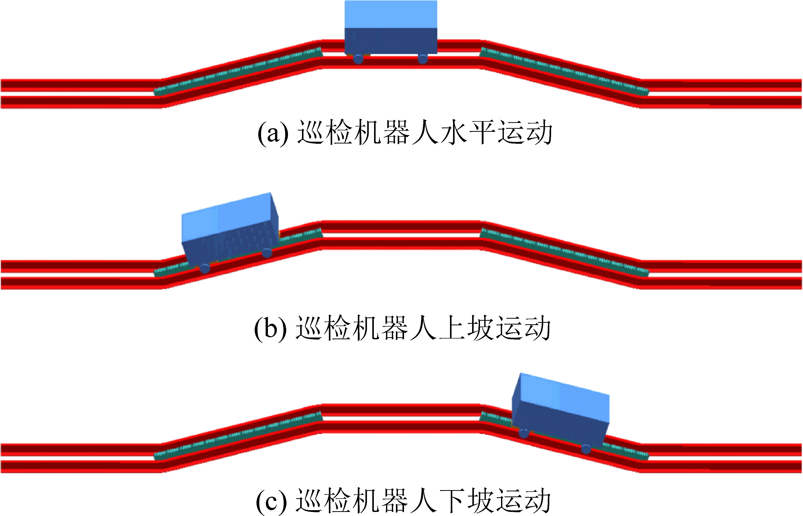 如图12a所示,巡检机器人即将由水平运动转换为上坡运动时,机器人位于水平轨道与坡度轨道的交界处,可以看出巡检机器人的前端与坡度轨道的上面不会干涉,巡检机器人的后端与水平轨道的上面不会干涉。如图12b所示,巡检机器人即将由上坡运动转换为水平运动时,机器人位于水平轨道与坡度轨道的交界处,可以看出巡检机器人底板的下面与轨道的上面不会干涉。