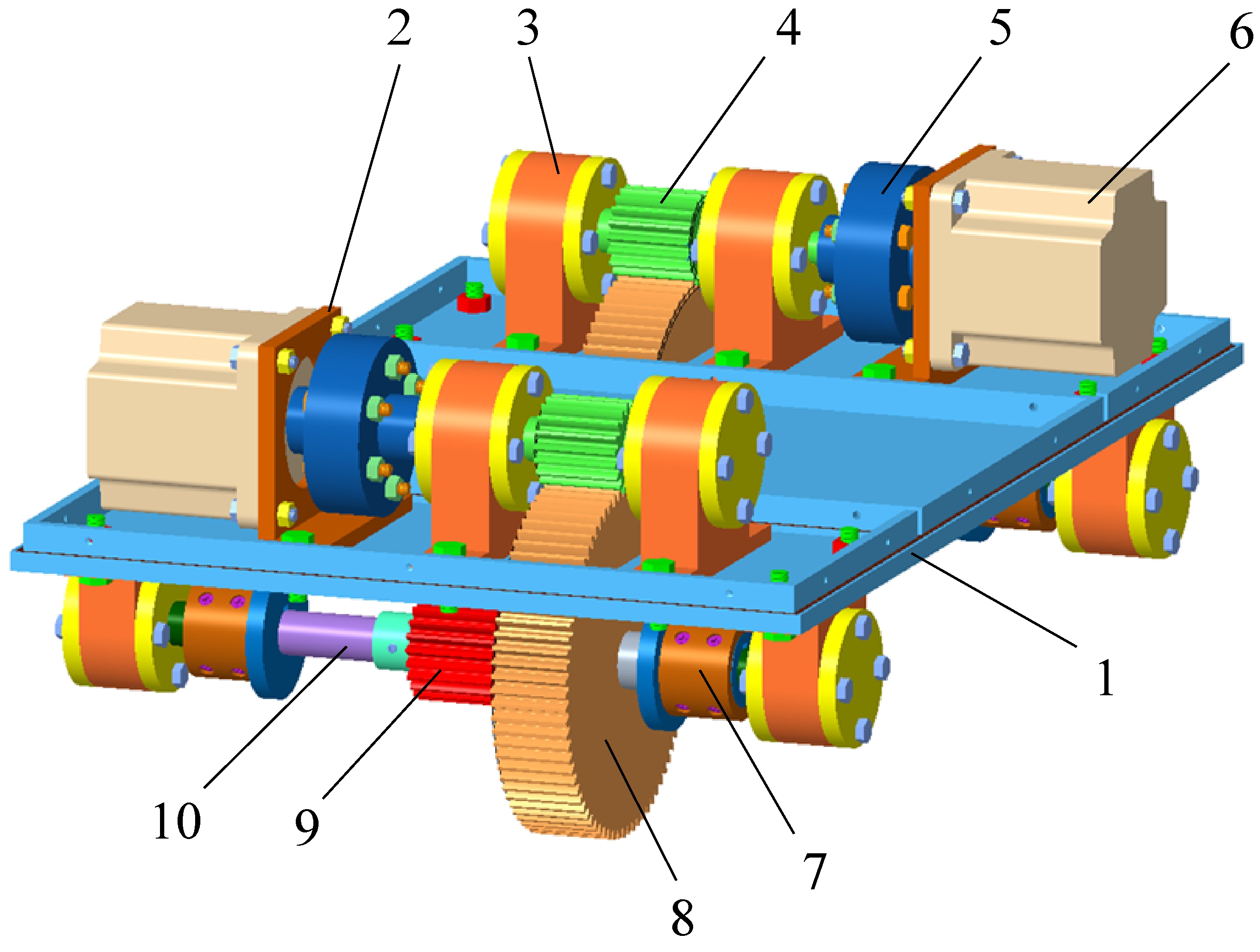 1—底板;2—电机支座;3—轴承座;4—齿轮轴;5—联轴器;6—电机;7—行走轮;8—传动大齿轮;9—行走齿轮;10—低速轴