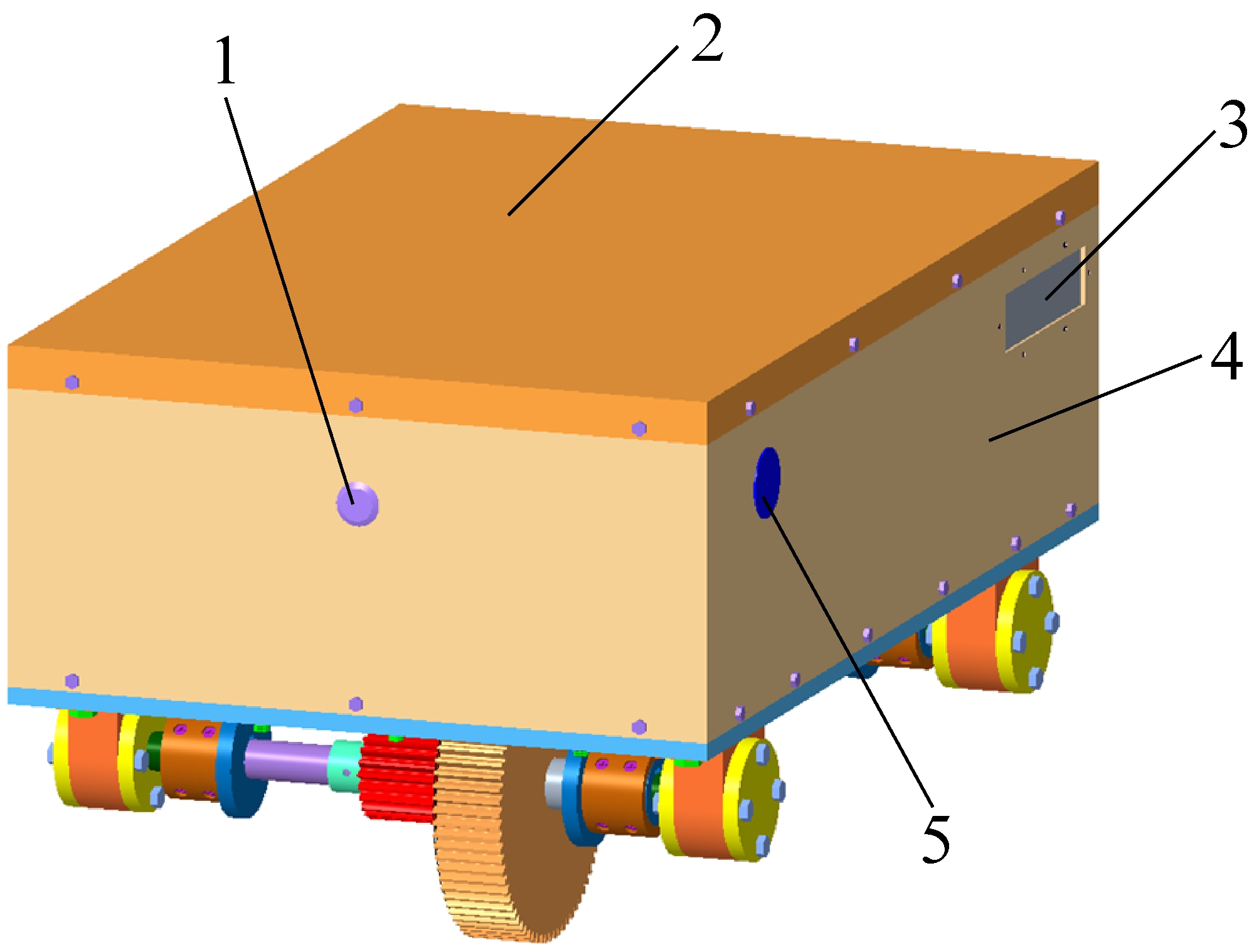 采用Creo 5.0软件对带式输送机自动巡检机器人的各个零件进行三维建模,其装配图如图5所示。巡检机器人的中央放置锂电池,壳体与底板通过螺栓连接。壳体边缘设置凹槽,密封条在凹槽中紧贴内侧的挡板。巡检机器人顶部安装了密封盖,密封盖与壳体通过螺栓连接。壳体左右两侧矩形的孔安装了钢化玻璃,保证了摄像头模块、温度传感器和声光报警模块等传感器的正常工作。壳体前后两侧的圆孔放置了防水型超声波传感器的超声波探头,壳体一侧的圆孔安装有防水拾音器。