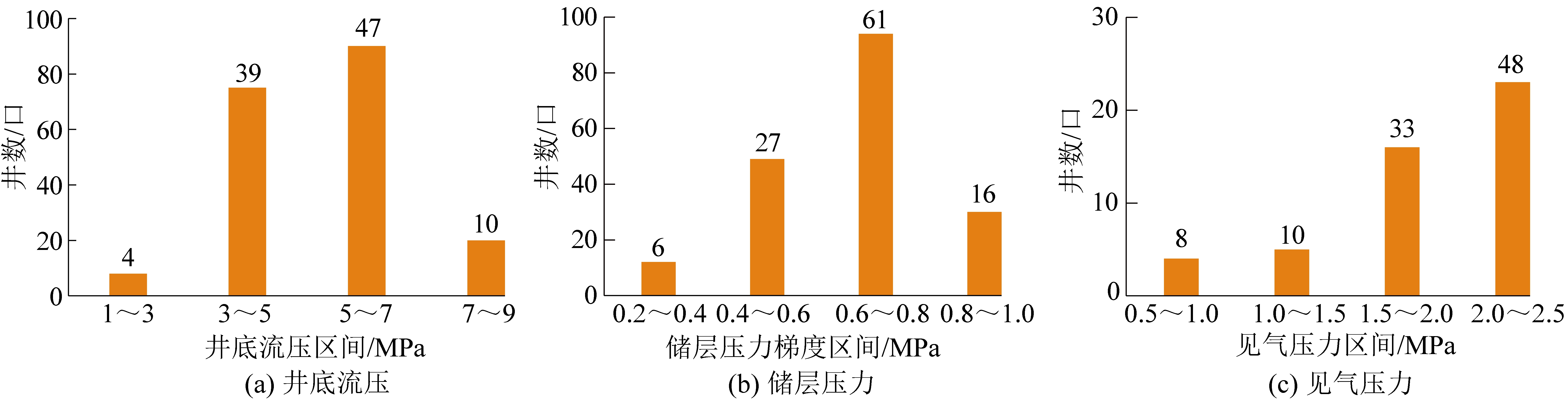 图4 研究区煤层井底流压、储层压力和见气压力分布区间
