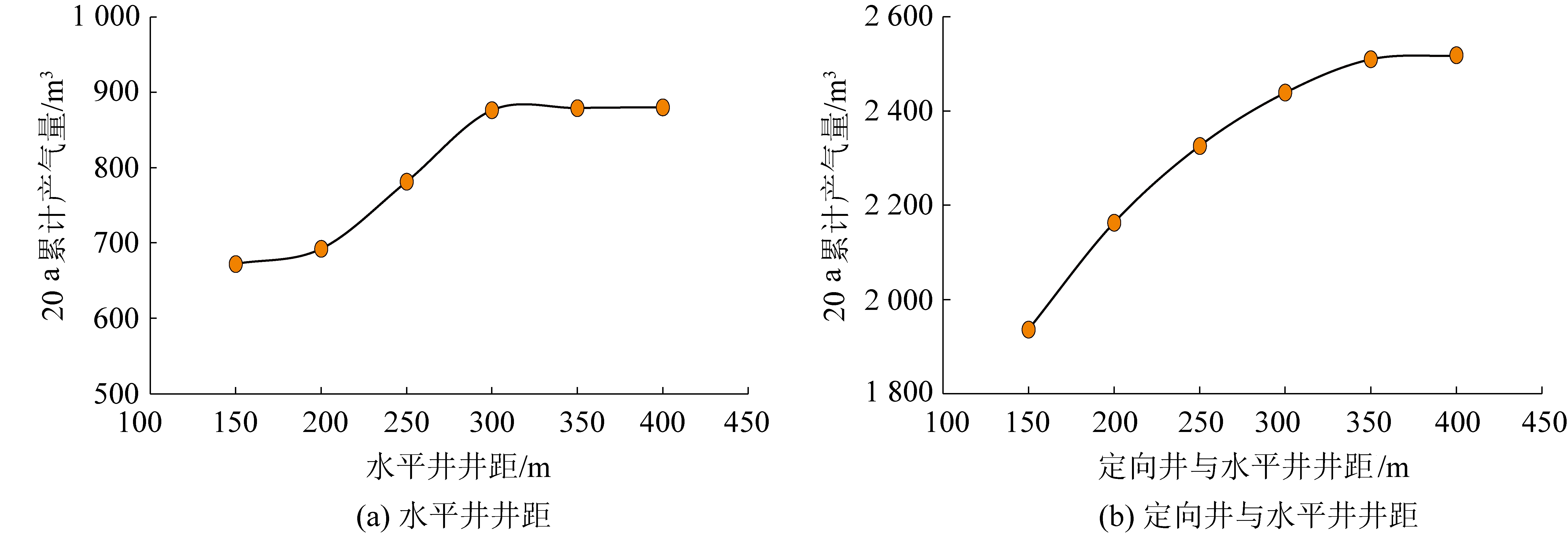 随着水平井井距的增加,单井累积产气量增加,但增加幅度在逐渐降低,当水平井井距达到300 m时,继续增加水平井井距,水平井累积产气量往后几乎不再增加,此时压力波达到最大波及范围,水平井井距最优为300 m。随着定向井与水平井距离的增加,压力波及范围增大,当距离增大至350 m时,产气量增加幅度大幅降低,在定向井与水平井距离达到350 m时,布井开发效率达到最大。随着短轴长度的增加,模型内定向井数量降低,相应的产气量降低,生产成本降低,经济效益先增加后降低,当短轴距离为200 m时,模型经济效益达到最大。随着定向井菱形井网长轴距离的增加,累计产气量逐渐增加,但增加幅度降低,当长轴距离达到300 m时,累计产气量几乎不再增加,此时的压降漏斗不在往外扩展,菱形井网最优长轴距离为300 m(图8)。