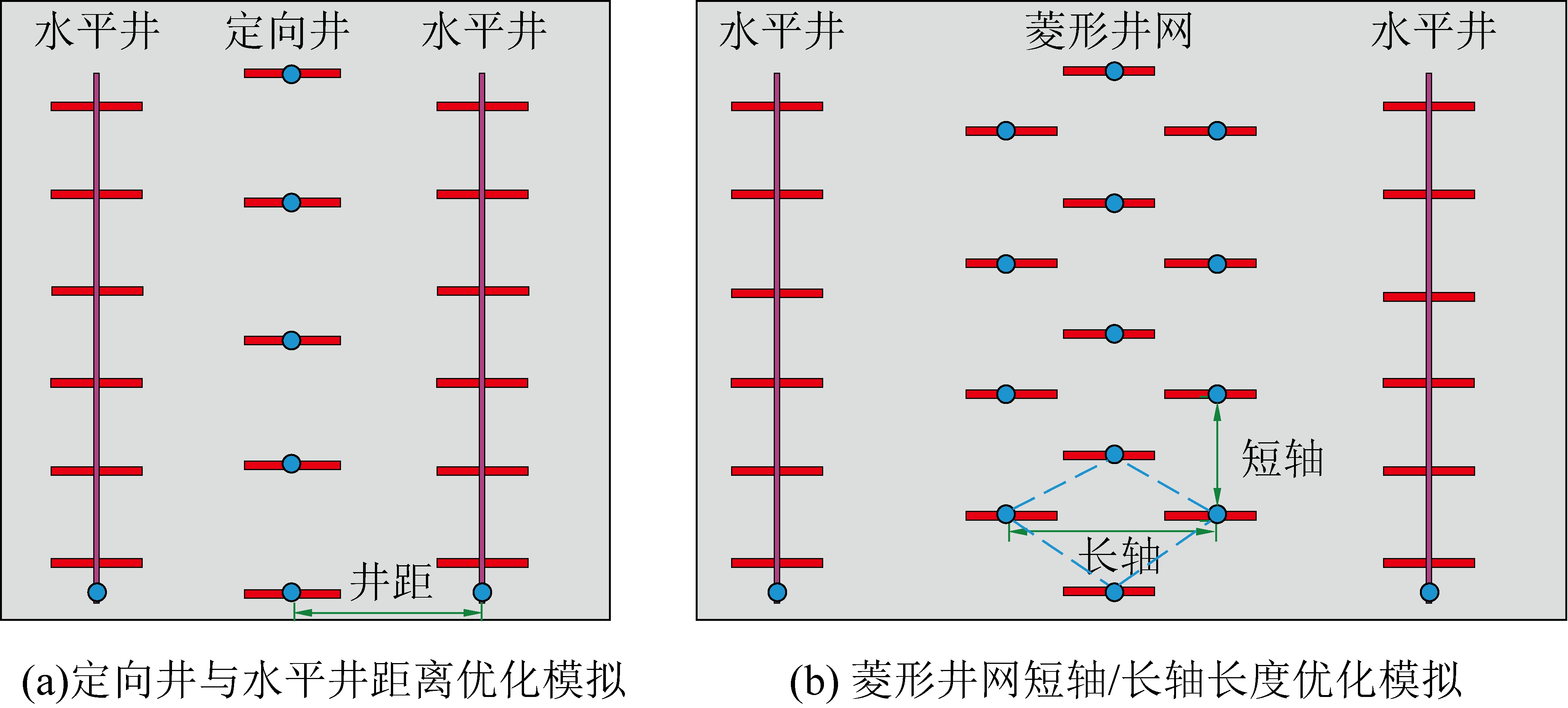 模拟不同井型单井及不同井网开发效果,以产能或经济性为原则对井型(包括水平井裂缝间距、水平井水平段长度、裂缝长度等)、井网(包括水平井井网、直井菱形井网及水平井+直井混合井网等)进行优化(图7),得到最优井型和井网。具体为:①以水平井经济效益为目标优化水平井长度,得出最大经济效益对应的水平井长度;②控制水平井长度一致,逐渐增加裂缝条数来缩小裂缝间距,得出最大经济效益对应的压裂段数;③通过水平井产气利润为目标优化裂缝长度,得出最大经济效益对应的裂缝长度。