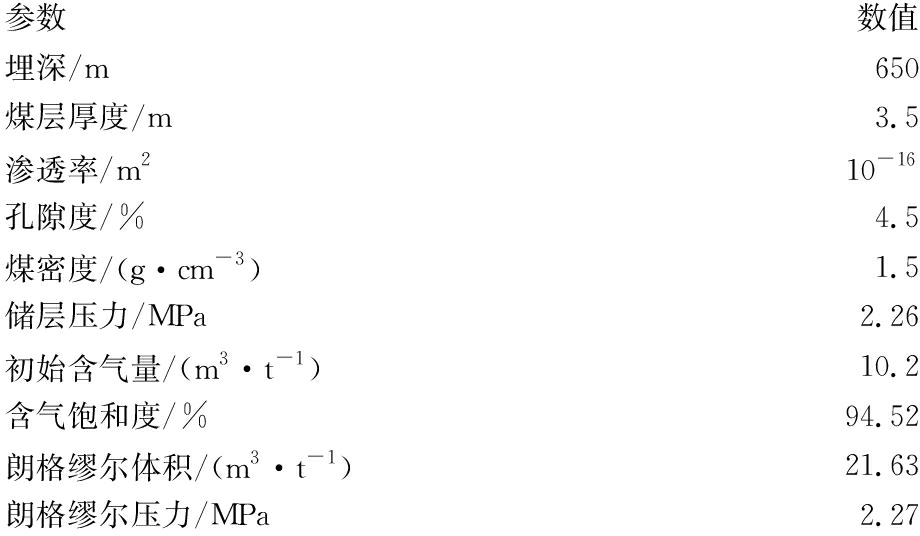 参数数值埋深/m650煤层厚度/m3.5渗透率/m210-16孔隙度/%4.5煤密度/(g·cm-3)1.5储层压力/MPa2.26初始含气量/(m3·t-1)10.2含气饱和度/%94.52朗格缪尔体积/(m3·t-1)21.63朗格缪尔压力/MPa2.27