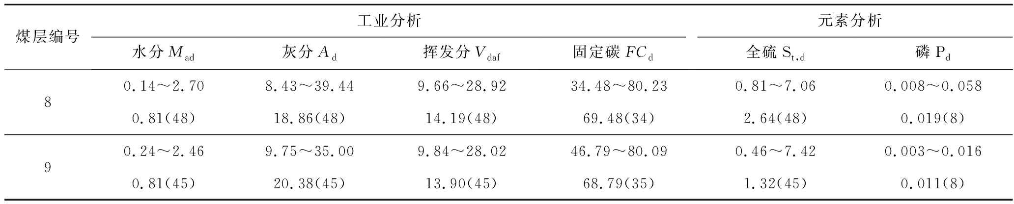 煤层编号 工业分析水分Mad灰分Ad挥发分Vdaf 元素分析固定碳FCd全硫St,d磷Pd80.14~2.708.43~39.449.66~28.9234.48~80.230.81~7.060.008~0.0580.81(48)18.86(48)14.19(48)69.48(34)2.64(48)0.019(8)90.24~2.469.75~35.009.84~28.0246.79~80.090.46~7.420.003~0.0160.81(45)20.38(45)13.90(45)68.79(35)1.32(45)0.011(8)
