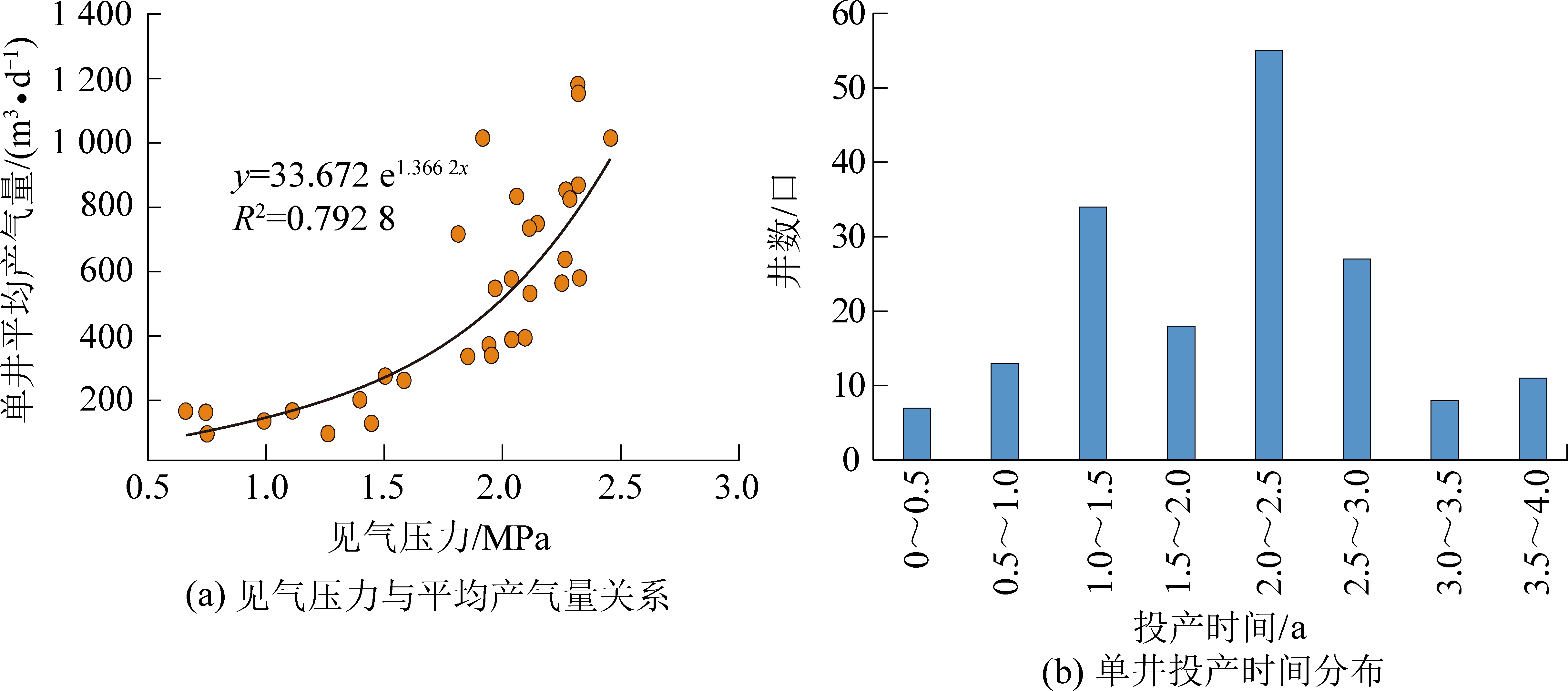 图5 研究区见气压力与平均产气量关系和单井投产时间分布