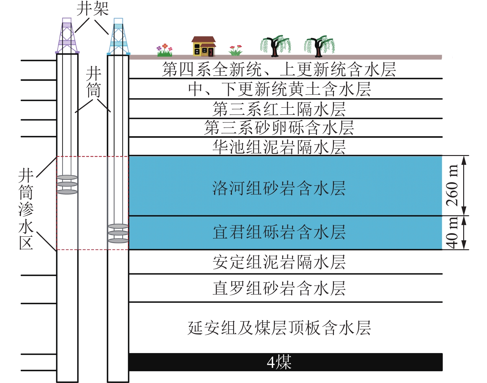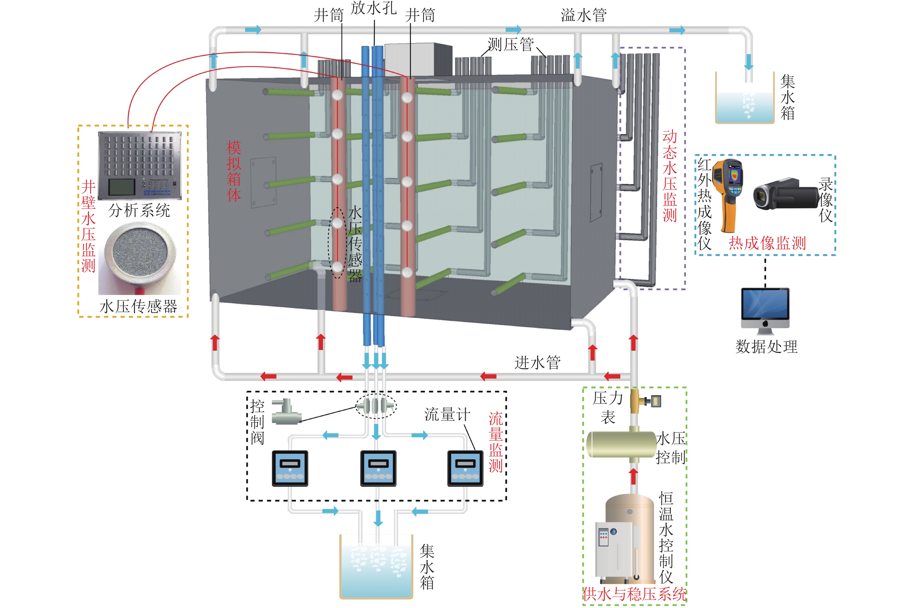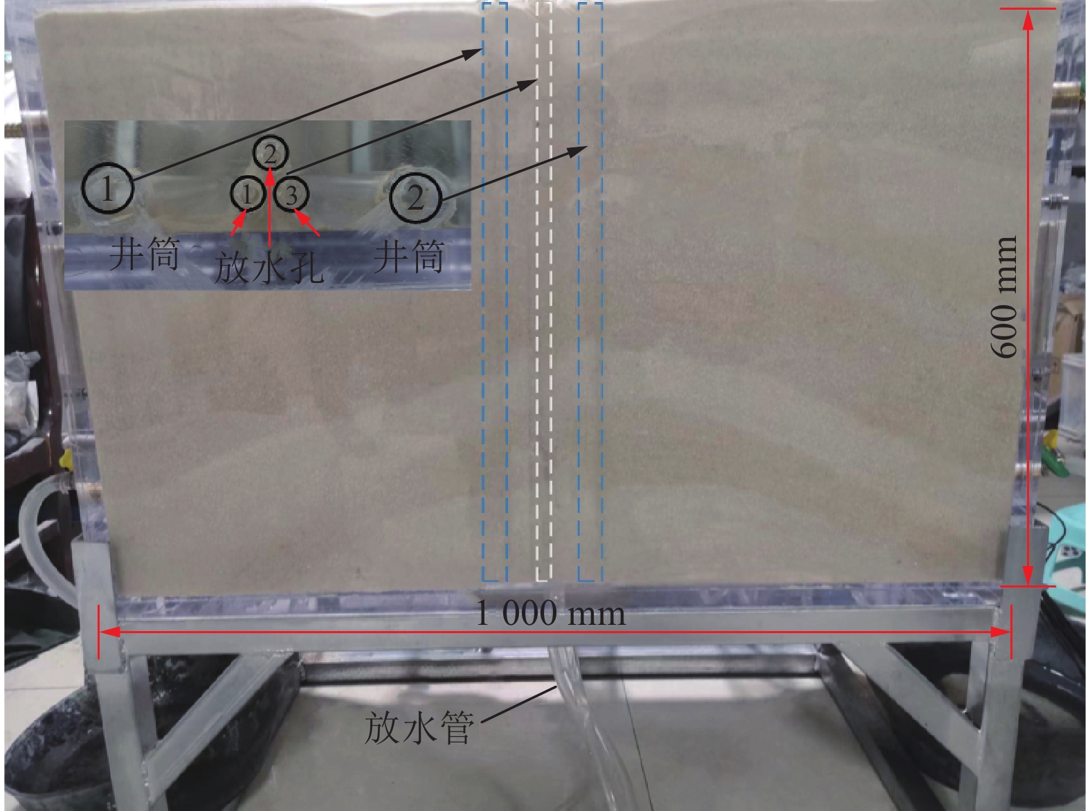 With the continuous development of China’s coal resources to the deep end, the complex conditions of rock stratum existence bring great challenges to the construction and use of shafts. Deep vertical shafts often traverse multi-layer aquifers, and the seepage problem of the shaft wall caused by roof pressure water is particularly serious, which not only threatens the mine safety, but also brings challenges to the traditional grouting management methods, such as high cost, difficult construction and repeated seepage problems. In this regard, a set of visual similar simulation experiment platform was established based on the hydrophobic pressure reduction theory, simulated the water pressure of the well wall and the change of the flow rate of the water discharge holes under the conditions of different rock formations and different number of water discharge holes, analyzed the flow rate and seepage law of the water discharge holes, the development law of the morphology of the groundwater landing funnels, and the change law of the seepage water pressure and the pressure law of the well wall. And take Binchang Wenjiapo coal mine as an example to carry out on-site water discharge test. The results show that: the flow rate at the outlet increases with the increase of pipe diameter; the water flow rate of two holes increases more than that of a single hole, and the water flow rate of three holes increases less; the closer to the well, the deeper the water level drops, the influence range of the landing funnel increases with the increase of the number of discharge holes, the shape of the landing funnel of the single-layer water discharge experiment is kept symmetrically with the descending holes, and the bottom end of the funnel shows a conical shape. The water pressure decreases quickly in the early stage of water discharge, and tends to stabilize in the later stage; the results of the simulation experiment are applied to the field, and the single-hole and double-hole water discharge tests are carried out by drilling sparse discharge holes between the main and auxiliary wells of the Wenjiapo Mine, and the stabilized water influx in the single-hole is 75 m