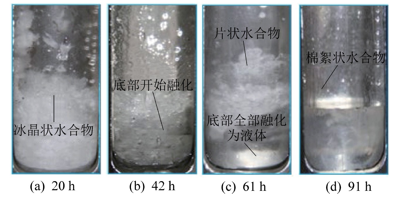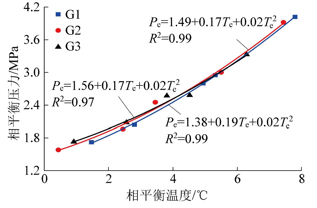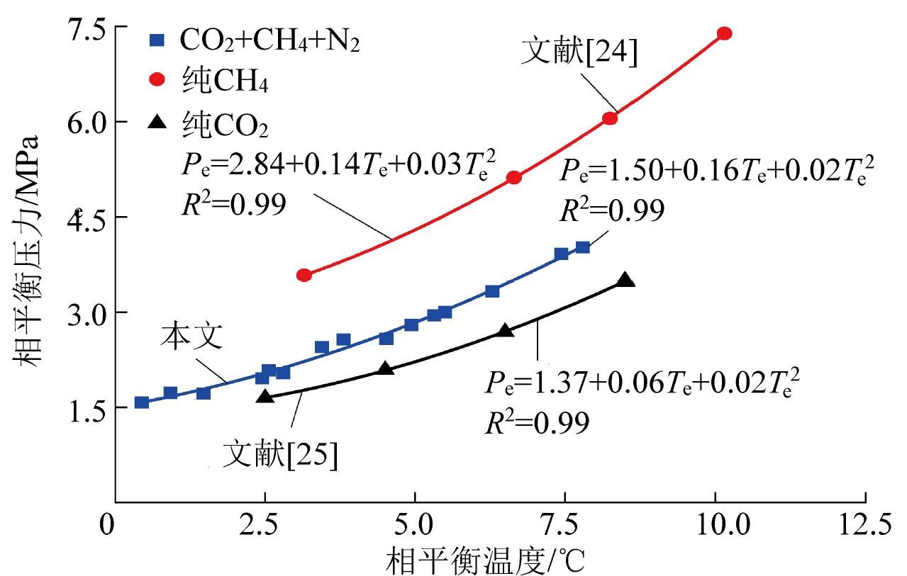 The determination of the phase equilibrium of high-concentration CO2 gas hydrate is a key issue in the uiliation of gas drainage based on gas hydratio n separation technology. Using the visual gas hydrate phase equilibrium device ,combined with the constant volume temperature search method and the observation met hod,the phase equilibrium conditions of three high-concentration CO2 gas samples at different temperatures and pressures were first measured,and the high-concentrat ion CO2 gas was proposed on the basis of the experiment.Then,a mathematical formula was fitted to describe the relation of phase equlibrium temperature and pressur e. In addition,the difference in hydrate phase eqilbrium between high-concentration CO2 gas samples and pure CO2 and pure CH4 gas samples is compared. The res ults show that the conditions for the formation of high-concentration CO2 gas hydrates are relatively mild. Specically,the phase equilibrium pressure in this test range i s the lowest at a temperature of 0.44 °C,which is 1.58 MPa; the phase equllibrium temperature and pressure of high-concentration CO2 gas hydrates are in a binomial r elationship; the phase equilibrium curve of CO2 gas hydrate lies between the phase equilibrium curve of pure CH4 and pure CO2 hydrate,and is closer to the phase equ ilibrium curve of pure CO2; at lower temperature and pressure( 0.44 ~ 4.94 。C,1.58 ~ 2.80 MPa),the gas increasing CO2 concentration in the sample can reduce the p hase equlibrium pressure of high-concentration CO2 gas hydrate and improve its phase equlibrium conditions. At higher temperature and pressure( 4.94~ 7.80 °C,2.80 ~ 4.02 MPa),the change of CO2 concentration in the gas sample has an effect on hydration. The phase equlibrium conditions have lttle effect; the difference between t he calculated value of the pressure obtained from the relationship between the phase eqilibrium temperature and pressure of high-concentration CO2 gas hydrate and the actual measured value is small,and the average relative error is 2.33%,which can accurately predict high concentrations CO2 gas hydrate phase equllibrium conditio ns. Phase equlibrium measurement results of coal mine gas with high CO2 concentration provide experimental reference and theoretical basis for the selection of temp erature and pressure in the gas separation and CO2 capture and sequestration technology based on the hydrate method.