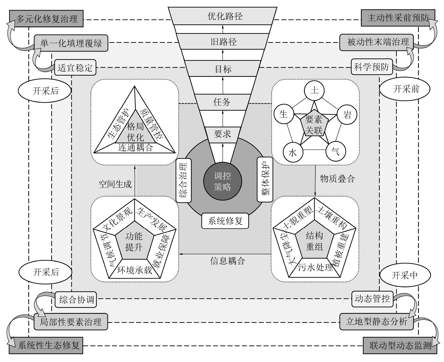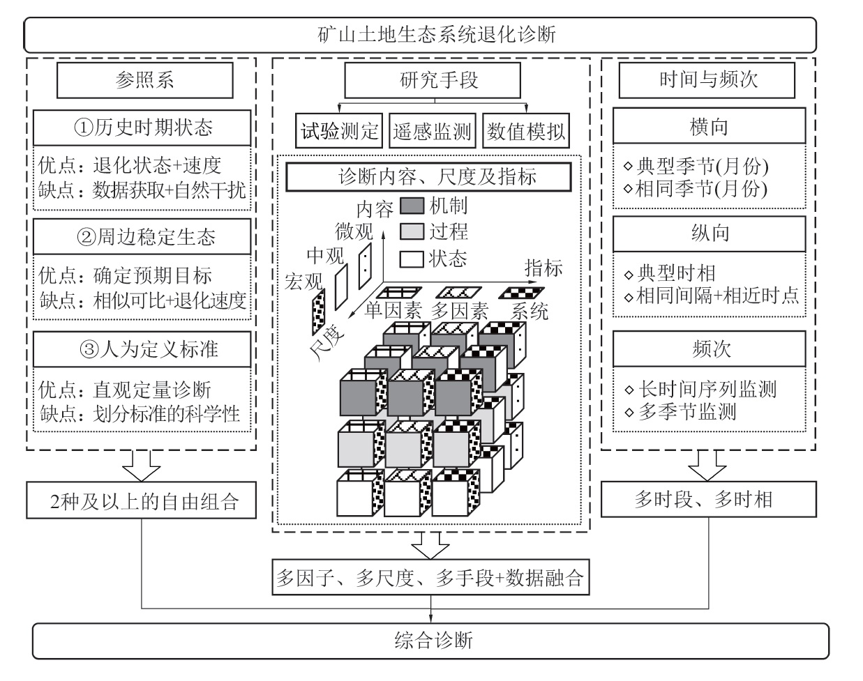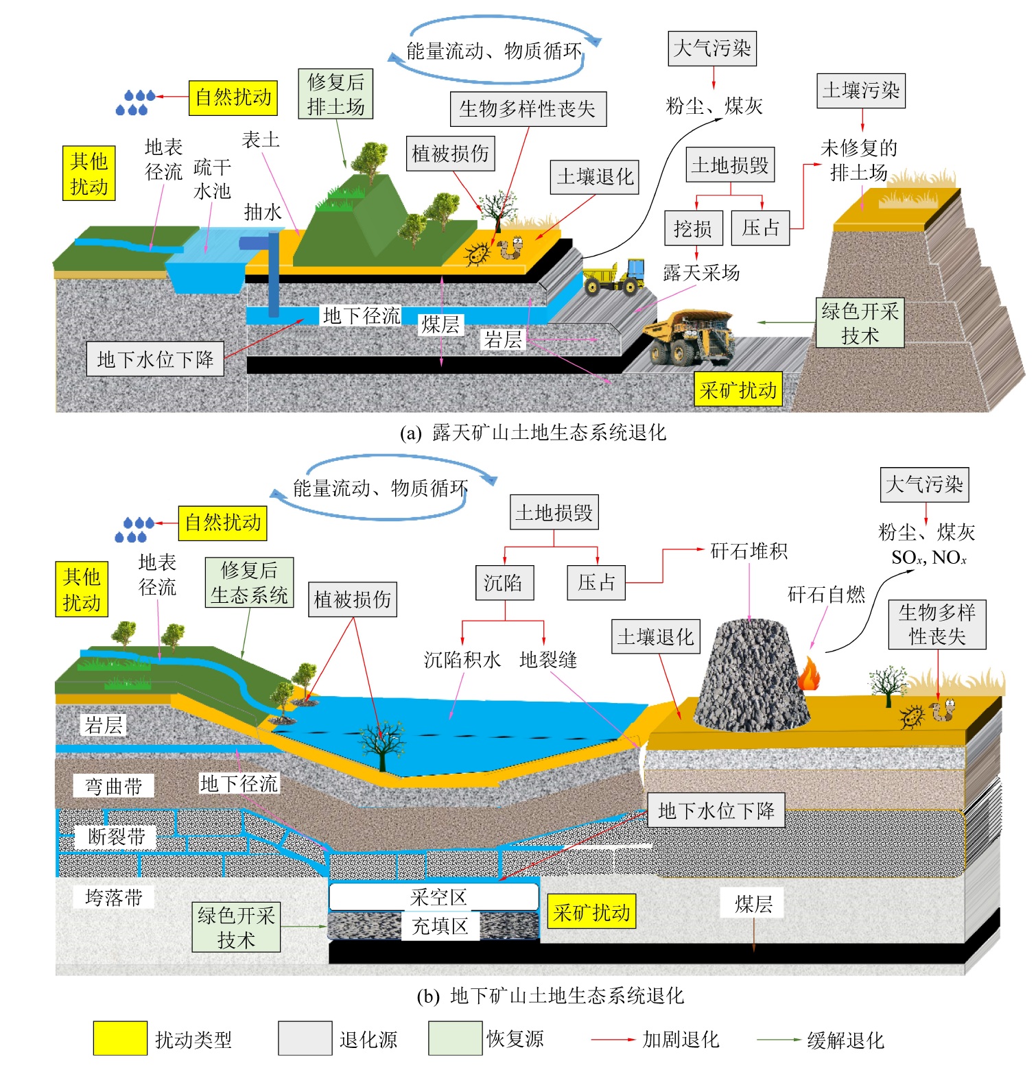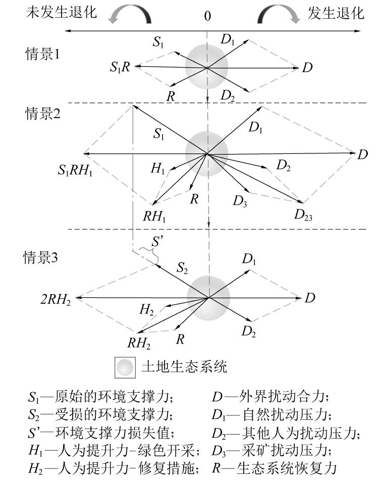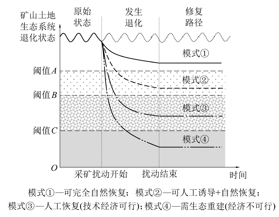 The idea of overall protection,system restoration,and comprehensive management make a clear claim for the ecological restoration in mining area.Howe ver,the concept of Land Ecosystem Degradation in Mining Area( LEDMA) could not been defined scientifically for a long time.Moreover,there was no uniform standard fo r diagnostic criteria and regulatory objectives of LEDMA. Based on the current knowledge at home and abroad,the concept of the LEDMA was redefined,and the connot ation of the LEDMA was figured out.Then,the influence factors of LEDMA were also dissected. Four influence factors were summarized ,including external disturbance pr essure,environmental carrying capacity,ecosystem resilience , artificial restoration.Furthermore the diagnostic criteria for LEDMA was identified,historical period state,per ipheral stable ecology,and artificial definition criteria. And the diagnostic methods included experimental testing,remote sensing monitoring and numerical simulation. Th en the selection of LEDMA diagnosis time and monitoring frequency were analyzed. The process of mining disturbance and its influence on the LEDMA was combed for diferent mining method.Therefore,three thresholds of LEDMA were proposed in order to judge the reversbility of the LEDMA. So,it could be seen that the old path of en d governance would no longer meet the requirements of green development in mining area.To sum up,we suppose the following control strategies to promote the syste matic restoration in mining area: proactive pre-harvest prevention, tandem dynamic monitoring,systematic ecological restoration,and optimized governance path.