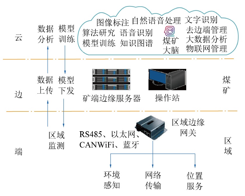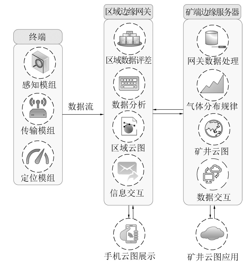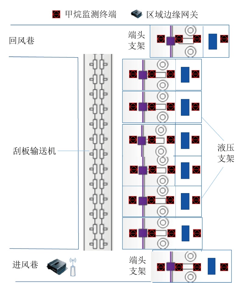 In view of the shortage of existing methane monitoring points in the coal face,and it can notmeet the the needs of methane sensing,analysis and early w arning in the coal face of smart mine construction. In combination with the edge of computing technology,mine Internet of things environment sensing technology and da ta transmission related technologies, analysis methane micropower perception,network transmission,monitoring terminal power supply and sensing location service issu es,a methane monitoring terminal that integratesmicro-power methane perception,self-powered supply,self-positioning,and self-organizing network data transmission wa s proposed. With the analysis of the work area regional edge gateway,mine-end edge servers and cloud big data,a system architecture of methane edge monitoring mo de was established based on cloud-edge and end to solve the problem of methane sensing and transmission based on edge computing in the face area.Taking the 100 hydraulic supports and 2 end support of coal faces as an example,a methane monitoring scheme based on edge calculation was designed in the Cartesian two-dimensi onal coordinate system to realize the monitoring of large amounts of data in the two-dimensional spatial range of methane concentration. The realization method of the methane concentration digital field with full coverage in the coal face area and the visual display method of the cloud image were proposed. On the basis of the spatial f ield of methane concentration and the cloud image display,two early warning modes and ideas for methane analysis based on big data support were proposed. One is t 0 perform correlation analysis of regional space field before and after methane over-limit concentration,and extract the corresponding methane over-limit in the coal fac e. The distribution characteristics and changing rules of the spatial field use the regional concentration field to detect the methane concentration over-limit problem as e arly as possible. Another one is to use a big data analysis tool to solve the problem of abnormal manifestation below the methane monitoring alarm threshold.