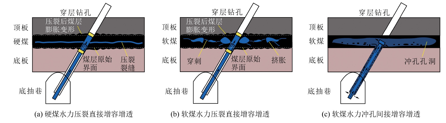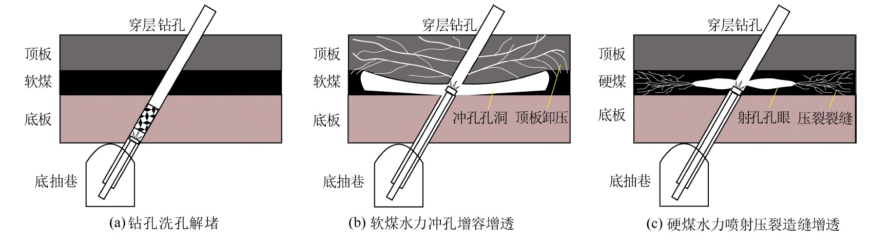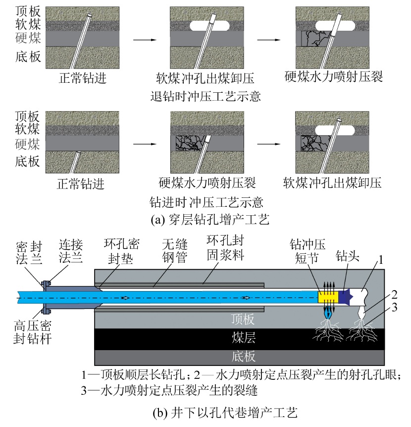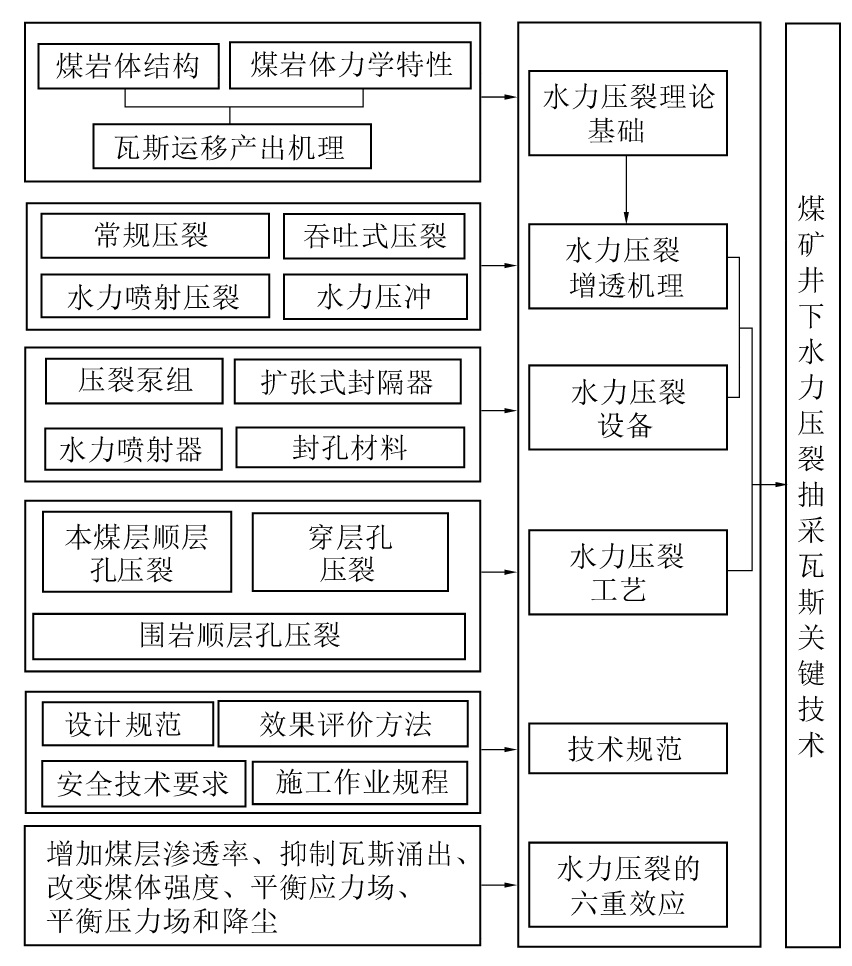 Gas extraction is the main way to control gas disasters in coal mines. For a long time, a variety of gas extraction technologies have been developed, which provide a powerful guarantee for the safe production of coal mines in China. However, for some serious outburst low-permeability coal seams, there are still problems of low extraction efficiency and high cost. There is an urgent need to form a system that can realize the transformation of gas extraction from " regular extraction to the quick, economical, pure and clean extraction" . Therefore, the quantitative characterization of coal and rock mass structure, gas migration and production mechanism, and gas migration and production process based on the structure of coal and rock mass were introduced firstly in this paper. The mechanism of gas extraction and production-increasing mechanism was clarified from the aspects of physical, biochemistry and surface modification. The research results of the team engaged in gas control work in the past 20 years are combined, a systematic analysis of six gas extraction technologies including hydraulic fracturing, integrated drilling and stamping, old hole repair, solid-liquid two phase hole sealing device and technology for three blocks and two injections, downhole automatic drainage, slag discharge and gas flooding, ground hole replacement for roadway were systematically analyzed, and self-developed equipment, devices and field application results were briefly introduced. It is pointed out that the coal body structure determines the transformability of the coal seam, determines the migration and production flow pattern of gas, and then puts forward the choice of gas extraction and production-increasing technology, which is the basis for the establishment of gas treatment technology system. The multiple production increase mechanisms of gas extraction were revealed, including permeability improvement from fracture generation, compacity enhancement, gas flooding, gas dilation, fracturing, microbial degradation, strong oxidant oxidation and surface modification, etc. It is indicated that the three technologies of hydraulic fracturing, drilling and stamping integration and the ground hole replacement for roadway are the hydraulic strengthening measures with permeability improvement and production increase as the main approaches. The three technologies of solid-liquid two phase hole sealing device and technology for three blocks and two injections, old holes repairing, downhole automatic drainage, slag discharge and gas flooding are based on multiple production-increasing mechanisms to extend the service life of the extraction boreholes and improve the quality and quantity of the extracted gas. The essence of gas flooding technology is to increase gas pressure gradient and realize gas extraction and increase production in low-pressure coal seam at the later stage of gas extraction. The completed engineering tests and application have fully demonstrated that the potential advantages of this technical system. With the further standardization and proceduralization of this technical system, it will become a universal technology for high-efficiency gas extraction in coal mines, and its popularization and application will greatly reduce cost of gas control.