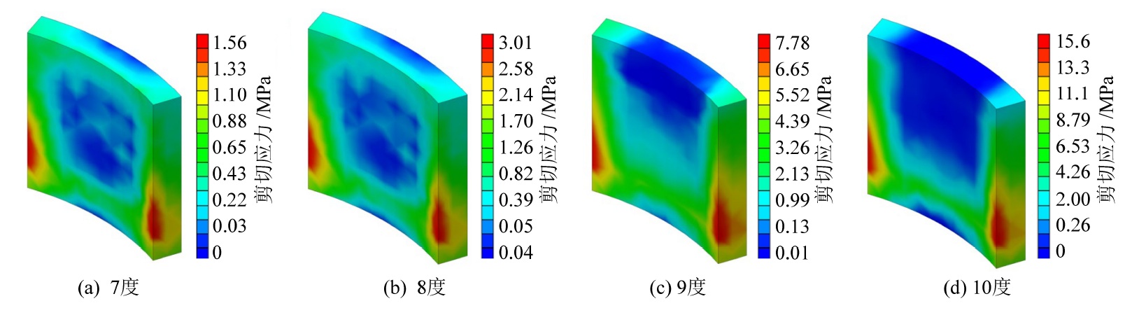 Coal mine underground reservoir has successfully constructed in Shendong Coal Mine Area in western China,as an original underground engineering str ucture.Safe operation is critical to coal mine underground reservoir.The dam of coal mine underground reservoir,especially artificial dam,is an important part for safe of the engineering.In order to ensure the safety of coal mine underground reservoirs under extreme conditions( such as mine earthquakes,earthquakes,etc.),it is necessar y to conduct seismic safety analysis of artificial dam structures.The artificial dam structure is generally flat. Considering that the damage of the dam structure undermin e earthquake or earthquake conditions is usually shear failure,a creative dam structure-artificial arch dam is put forward to improve the seismic performance of the artifi cial dam,and force of artificial plat and arch dam is analyzed.Using FEM,shear stresses and displacement cloud chart of artificial plat and arch dam is obtained,with diff erent earthquake intensity( 7,8,9 and 10 degree) and same numerical parameters.Weak position safety factors of artificial plat and arch dam are compared and analyze d.The result reveal following: the contact part between artificial dam and coal stratum is weakest of the coal mine underground reservoir; artificial dam is safe in operati on under extreme operating conditions due to the restraint of roof,floor,coal pillar and stratum,as the safety factor of artificial arch dam and artificial plat dam are 22.6 a nd 6.4 when earthquake intensity is 10 degree; the action of the arch causes partial compressive stress in the reaction force of the coal pillar on the artificial dam body, part of the seismic load received by the arch artificial dam body is transferred to the coal pillar dam body,reducing the artificial dam body shear caused by the mine eart hquake,which improves the seismic performance of the arched artificial dam.