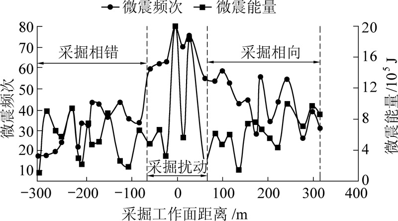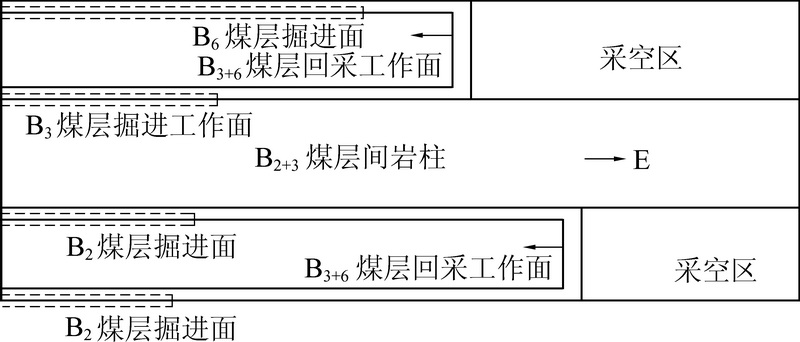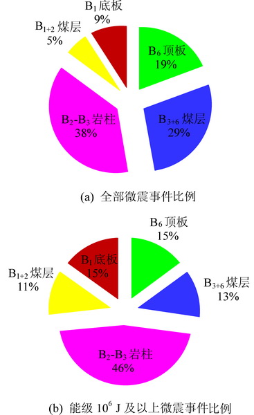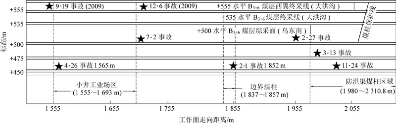 In order to grasp the hazardous factors of rock burst in sub-erect coalseamin the southernpart of Wudong coal mine, based on the mining layout and occurrence characteristics of overlying coal pillars in B3+6 coal seam, the data statistics method is used to separately distribute the mine microseismic events and rock burst accidents in fully-mechanized caving face of B3+6 coal seam. The results show that the overlying coal pillar is the main disaster-causing factor of rock burst, and mining disturbance, mining depth and coal pillar resource recovery are the influencing factors of rock burst. The influence of mining disturbance is obvious when the distance of fully mechanized mining face and the development face of different coal seams during mining is 80 m and when the mining crossing distance is 110 m, and the frequency of microseisms reaches the peak when advancing difference of the two faces is with in 0~30 m.B3+6 coal seam rock burst accidents are concentrated in the pillar area of a small shaft and the industrial square areaof Dahonggou coalmine. After multi-layer mining, the stress effect of overlying coal pillar still exists, and with the increase of the numbers of coal seam mining layers, the relationship between the location of the working face and the coal pillar changed following a regular law as "before the coal pillar - under the coal pillar - after the coal pillar". When the bump pressure occurs, the fully-mechanized top coal caving face during rock burst accident concentrated in the 50 m range of coal pillar boundary, and the location and times of rock burst accident are related to the length of the coal pillar.With the increase of the striking length of the overlying pillar, the distance between the fully-mechanized caving face and the boundary of the pillar increases when the rock burst accident occurs. At the same time, the probability and failure strength of the rock burst accident in the area near the coal pillar also increase.