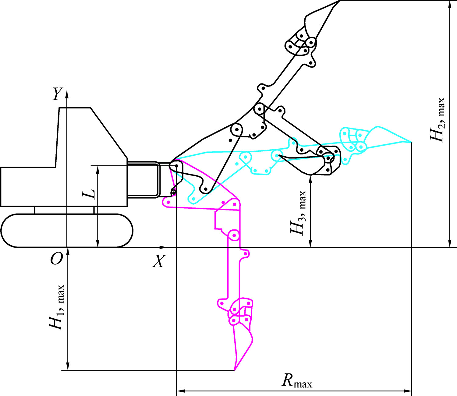 In view of the unloading height requirements of the coal mine underground roadway repairing machine under the limited roadway height, the structure of backhoe working device was determined. The kinematic model of the working device was established based on the Denavit-Hatenberg homogeneous transformation matrix. The position expression of the bucket tooth tip in the coordinate system is derived, and the spatial constraints of backhoe working devicewere determined. Aiming at improving the digging force of the whole machine, and using the working space limitation of the roadway repairing machine as a constraint condition, the genetic algorithm was used to optimize the working device. The optimization results show that the excavation force of the backhoe working device increases by 9.4%; the length of boom is shortened by 8.9%, the length of intermediate arm increases by 47.9%,the length of arm is shortened by 18.7% and the total length of the working device is shortened by 3.6% to cost savings. It is clear that space constraints have significant effects on design variables and digging forces.