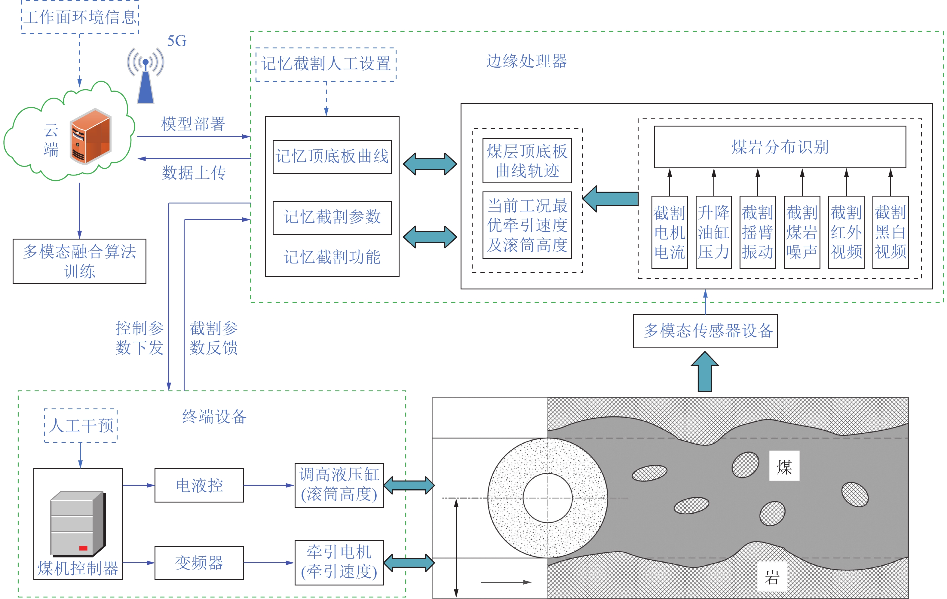 The current shearer control system is difficult to deal with the complex working conditions of the underground working face. The realization of the intelligent height and speed regulation control of the shearer is faced with three major technical problems:the lack of data communication capacity of traditional 4G, WiFi and other wireless communication technologies, the low data processing synergy of the centralized cloud computing platform, and the need for high manual intervention assistance for coal cutting control. In order to promote the intelligent development of the shearer and the whole fully mechanized mining face, starting from solving the key technologies of the shearer such as 5G communication technology, cloud-side-end collaboration technology, intelligent height and speed regulation control technology, a shearer intelligent height and speed regulation control system based on 5G+cloud-side-end collaboration technology was developed, and the 5G communication technology and cloud-side-end collaboration technology used in the system were described in detail, the hardware platform and communication network of the shearer intelligent height adjustment and speed regulation control system were introduced. The shearer intelligent height and speed regulation control system adopts a multimodal fusion coal rock distribution identification model based on feature level fusion and decision level complementarity, and on the basis of coal rock distribution identification technology, the shearer intelligent height adjustment and speed regulation control strategy of "memory cutting coal+coal rock distribution identification intervention" is used for cutting control. The 81309 Working Face in Shendong Baode Coal Mine conducted a 2-month application test of the control system, the test results showed that the packet loss rate of the real-time communication of the shearer was about 0.003%, the end-to-end average communication delay between the shearer and the centralized control center had decreased by 75%, the failure rate of the shearer drum had decreased by 42%, and the coal gangue mixing rate of the front scraper conveyor had decreased by 42.9%, which verified the practicality and feasibility of the shearer intelligent control system and the hardware platform. The work improved the intelligent degree and reliability level of shearer control, which can be popularized and applied to promote the intelligent development of fully mechanized mining face.