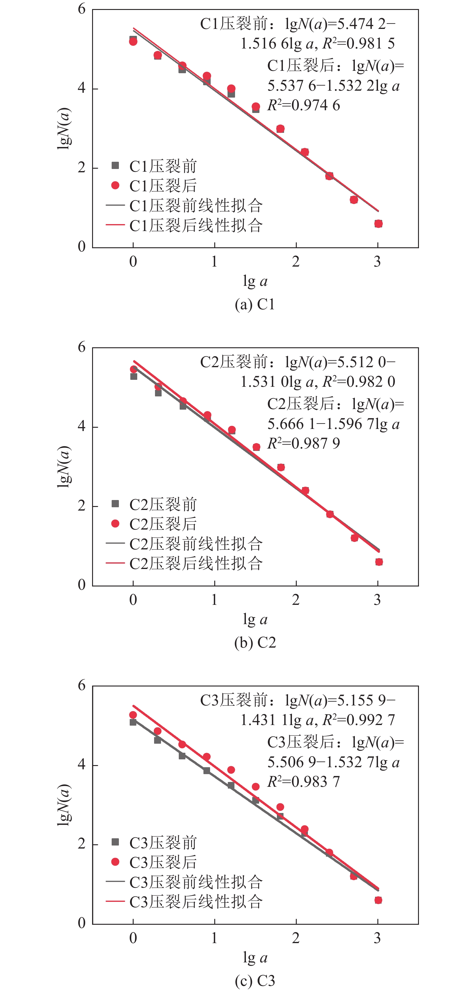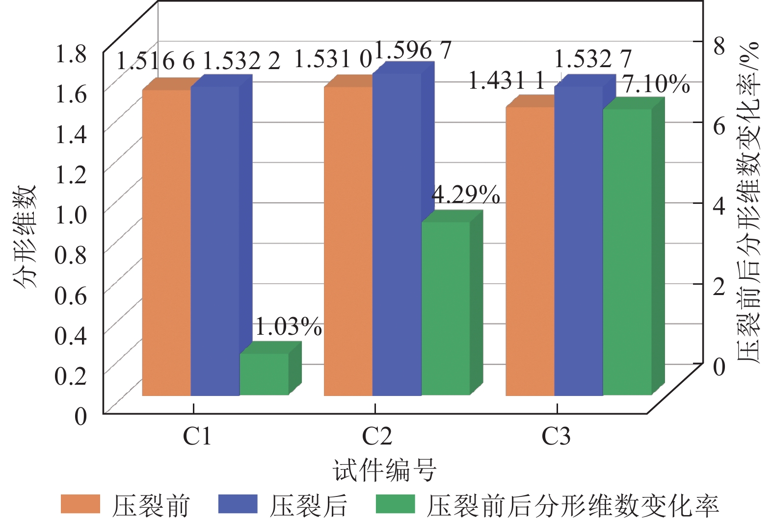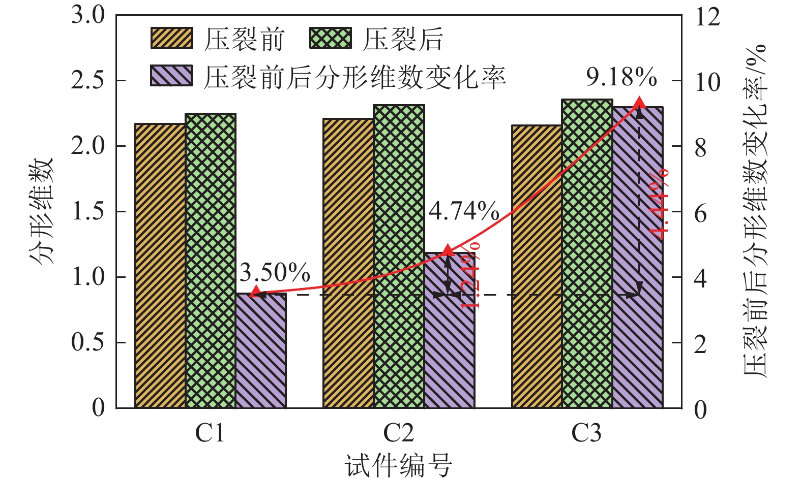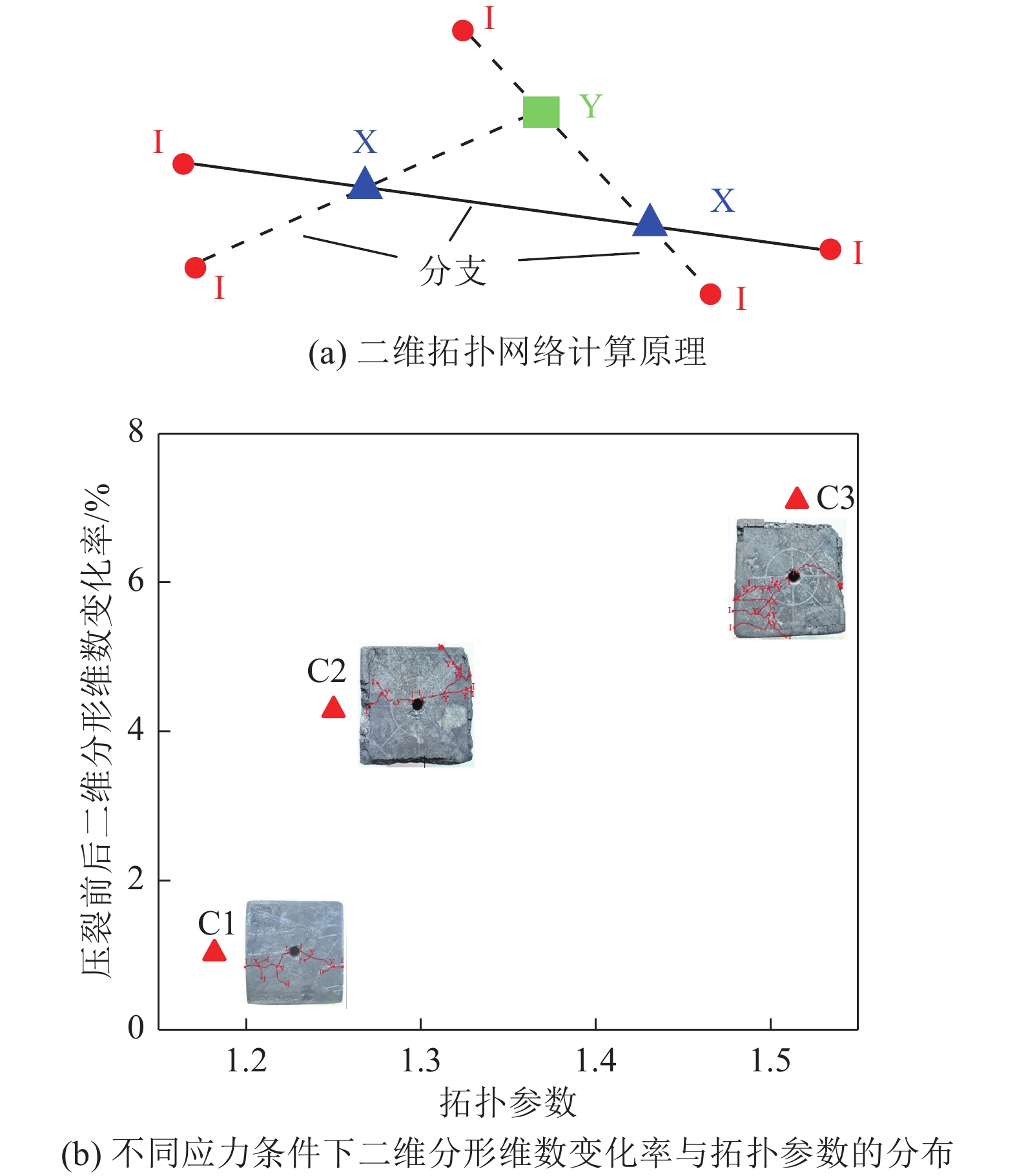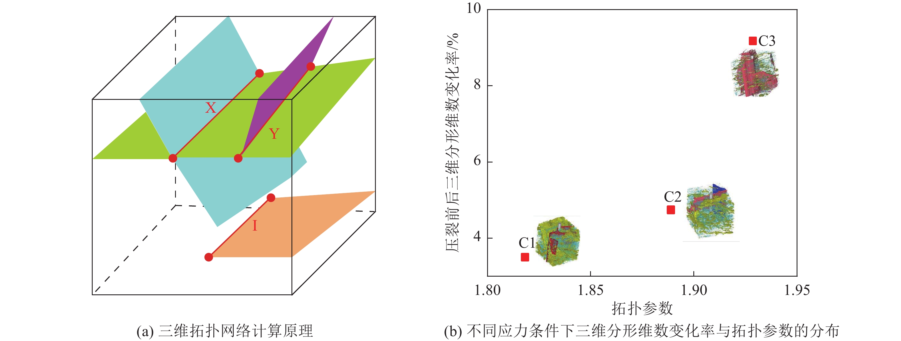 K) are 1.03% ~ 7.10%, and the change rate of three-dimensional fractal dimension are 3.50% ~ 9.18%, the two-dimensional and three-dimensional fractal dimensions of coal samples after hydraulic fracturing increase significantly. The method based on fractal theory and topology can effectively characterize the fracture structure and fracture forming ability of hydraulic fracturing. The two-dimensional topological parameter of coal samples after fracturing are1.18 ~ 1.52, which is positively correlated with the change rate of two-dimensional fractal dimension.Increasing rate of change rate of two-dimensional fractal dimension decreases with the increase of topological parameters. The reconstructed internal structure and fracture distribution showed that the three-dimensional fractal dimension after fracturing is more advantaged than the two-dimensional fractal dimension. The three-dimensional topological parameters of coal samples after fracturing are 1.82-1.93, increased with the increase of the change rate of three-dimensional fractal dimension. The intermediate principal stress has a positive effect on the seam forming ability of coal seam. The fractal dimension and topological parameters increase with the increase of intermediate principal stress before and after hydraulic fracturing. In other words, Increased with the intermediate principal stress, the resulting fracture network is more complex, the connectivity is better, and the fracture forming ability of hydraulic fracturing is stronger.