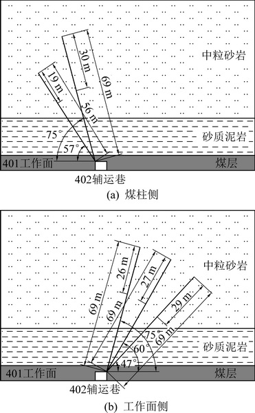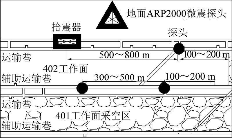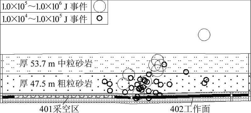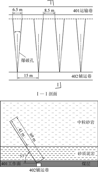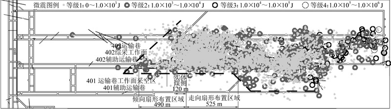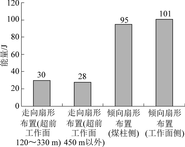 In view of the phenomenon of frequent occurrence of high-energy mine earthquakes caused by the roof breakage of weakly bonded thick layer with wide coal pillars in Hongqinghe coal mine, theoretical analysis, micro-seismic monitoring and field test methods were used to determine the occurrence of high-energy mine earthquakes and the pressure relief of deep hole blasting of roof. Two schemes were proposed, i.e. the fan-shaped layout along the strike with charge of 2.5 kg/m and the fan-shaped layout along the dip with charge of 4 kg/m.Based on the combined monitoring method of the underground site and the ground micro-seismic system, the micro-seismic signals induced by the deep hole blasting vibration of the roof were accurately located, and the pressure relief effects of the two schemes were compared and analyzed by the indicators monitored by the micro-seismic system.The results show that roof blasting with fan-shaped layout along the strike mainly induces 1.0×103~1.0×104 J micro-seismic events, and that layout along the dip mainly induces 1.0×104 J or more micro-seismic events. From the indicator of induced energy per kilogram of explosives, it can be found that in the layout scheme along the strike, the blast-induced energy in the range of advance bearing pressure of the working face has increased slightly, but the rising range is not large; in the layout scheme along the dip, the induced energy of roof blasting at the working face side increases by about 6.3% compared with that at the coal pillar side; In the fan-shaped layout scheme along the dip, the induced energy per kilogram of explosive is more than three times of that in the scheme along the strike. Combined with the actual situation of the No.402 working face in Hongqinghe coal mine, the validity and feasibility of the fan-shaped layout scheme along the strike beyond 450 m ahead of the working face were determined, and it was verified that the scheme along the strike can achieve better blasting pressure relief effect. The results of micro-seismic positioning during mining of the working face further showed that whether adopting the scheme along the strikeor the scheme along the dip to carry out the roof deep hole pressure relief blasting, it can play a good role in the roof blasting pressure relief effect.