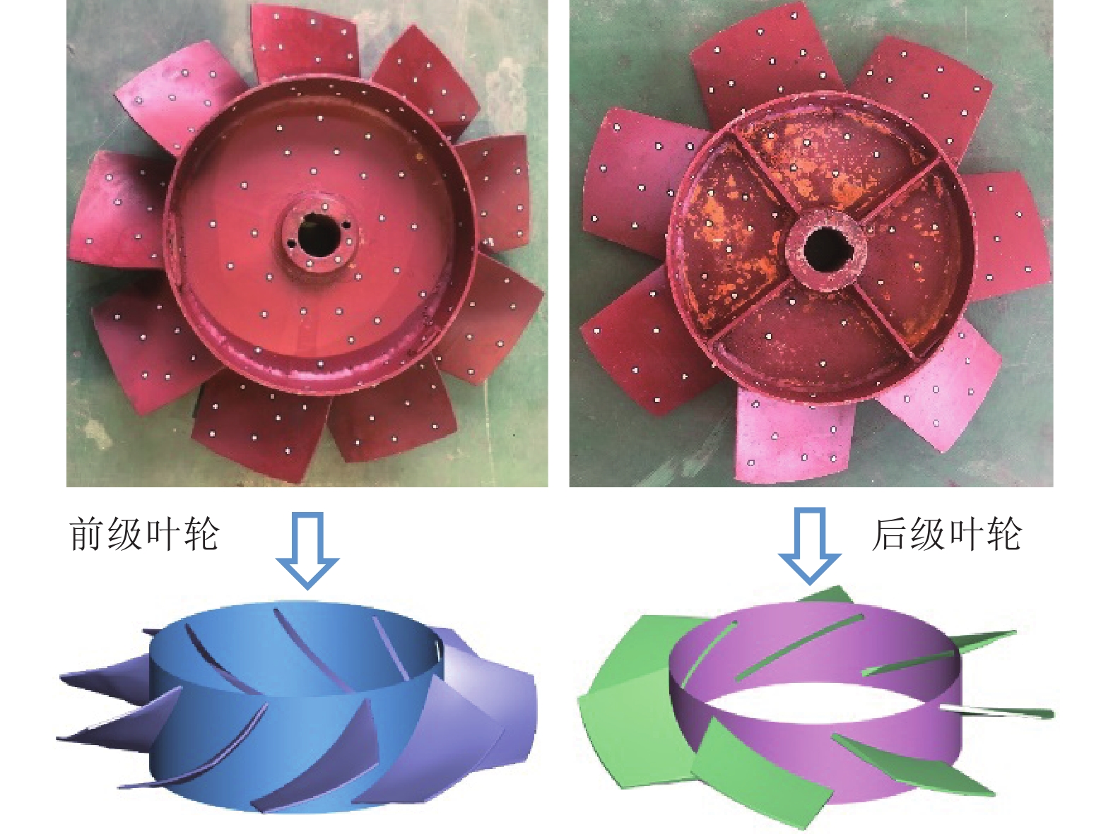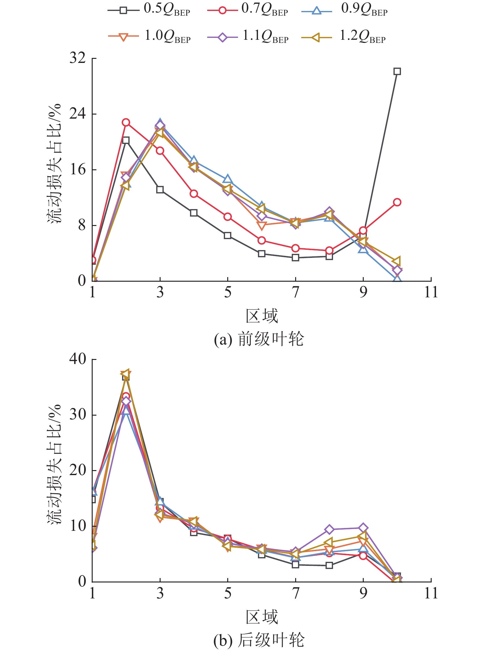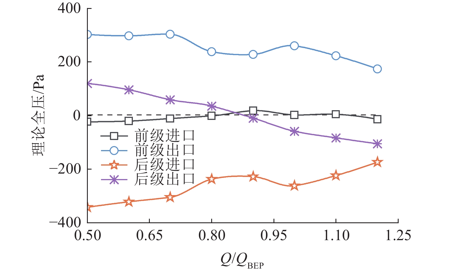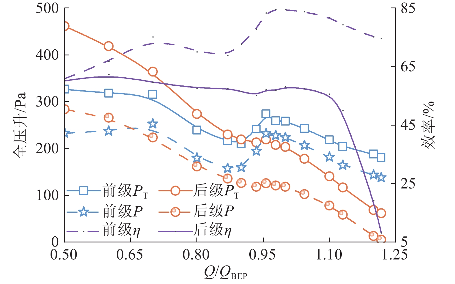 QBEP, the efficiency difference between the two-stage impellers is about 26.5%, and the efficiency difference is as high as 66.6% when the flowrate increases to 1.22