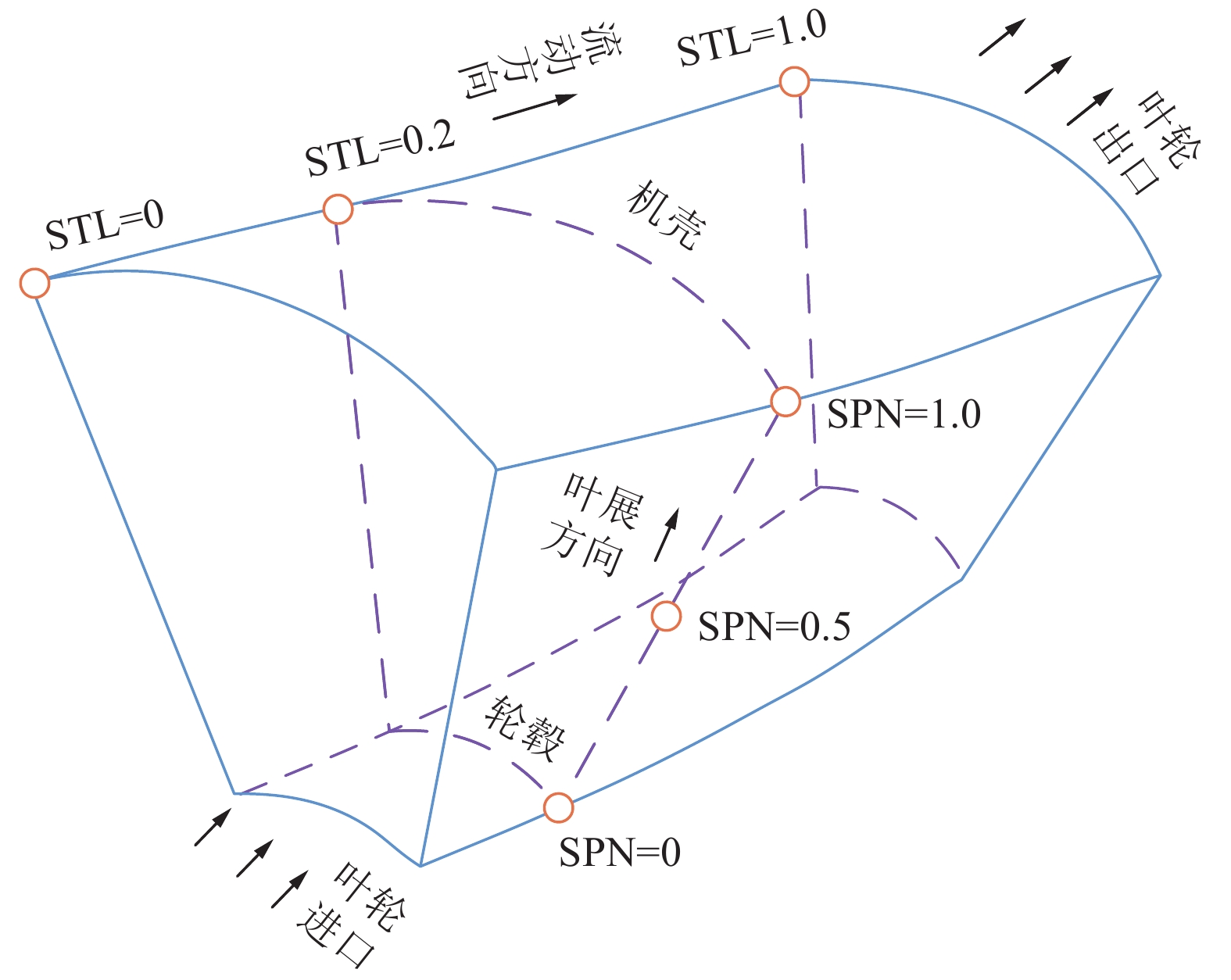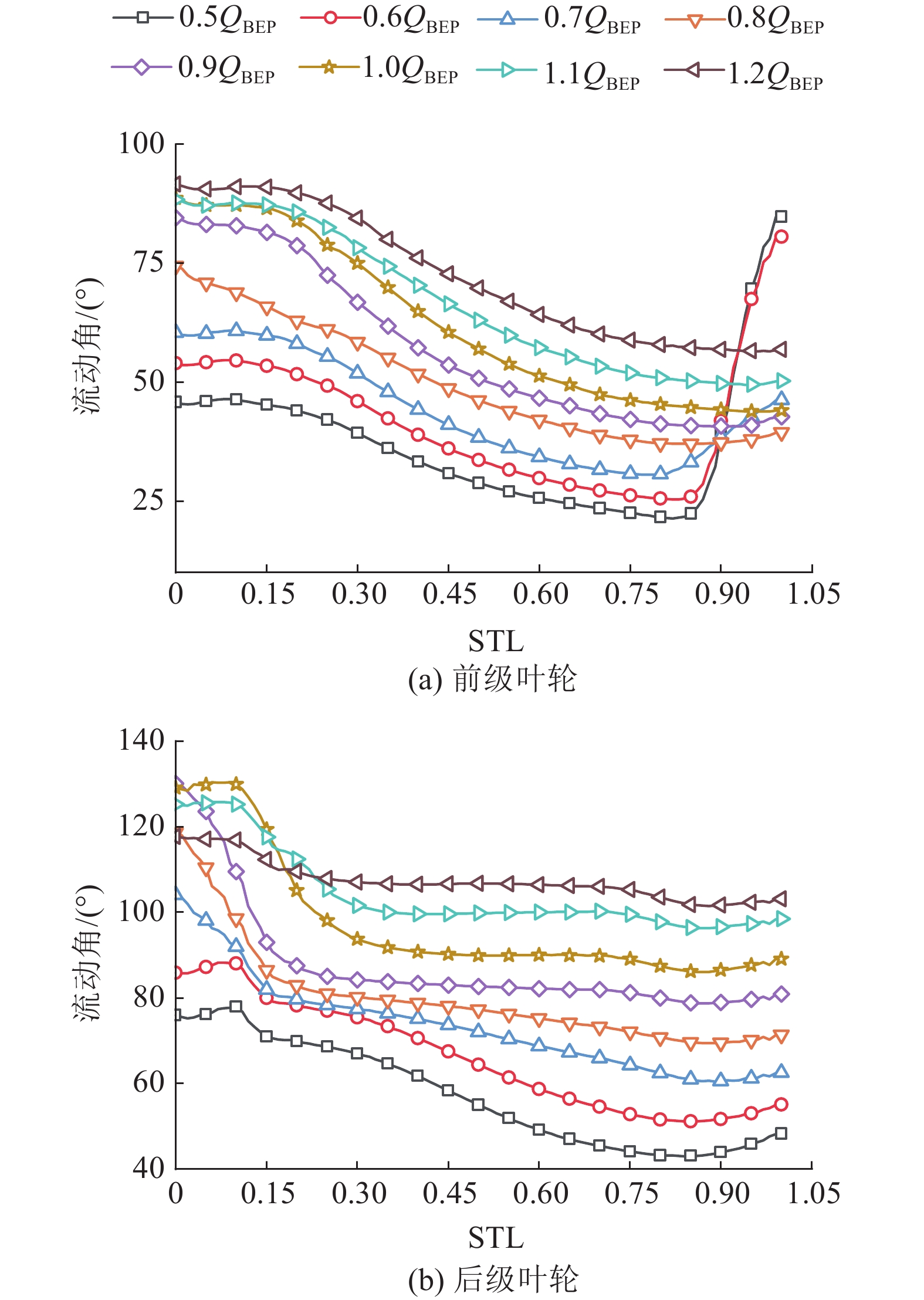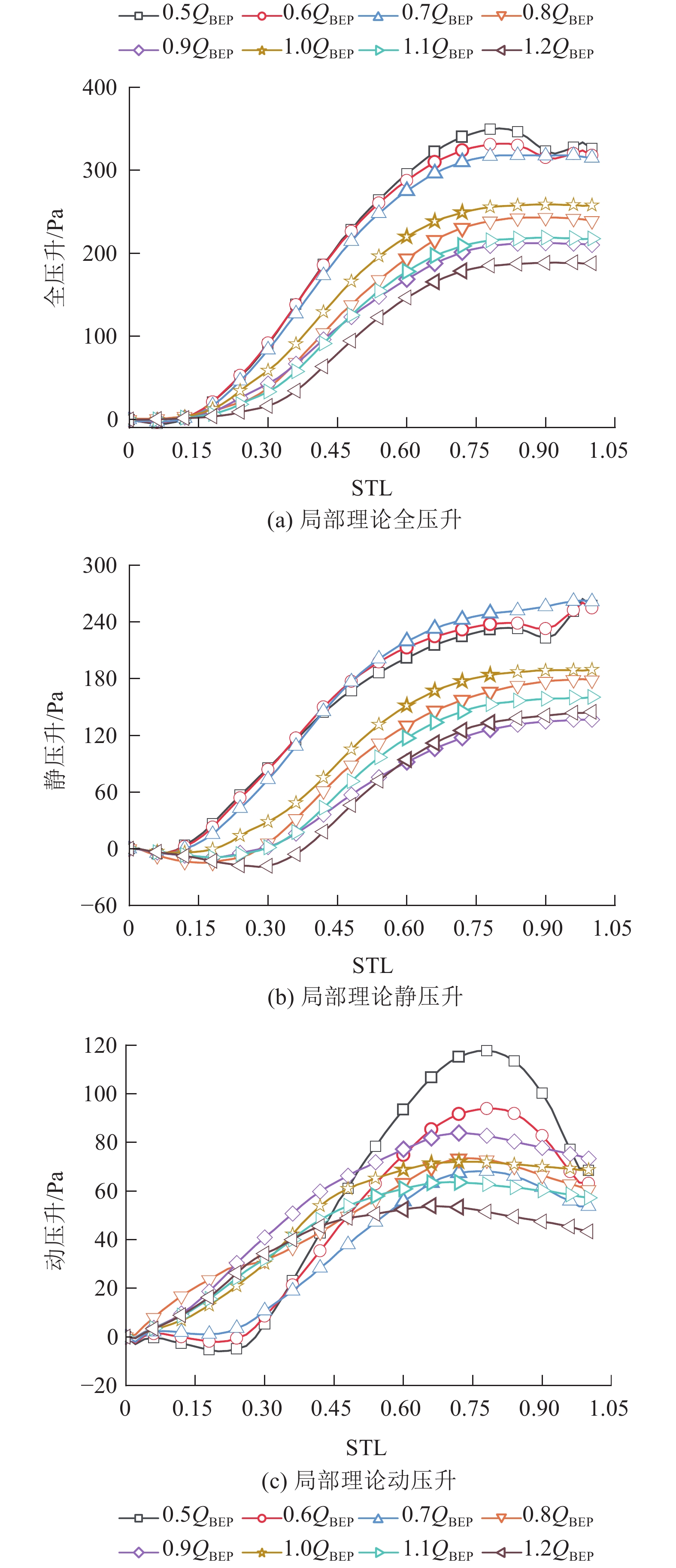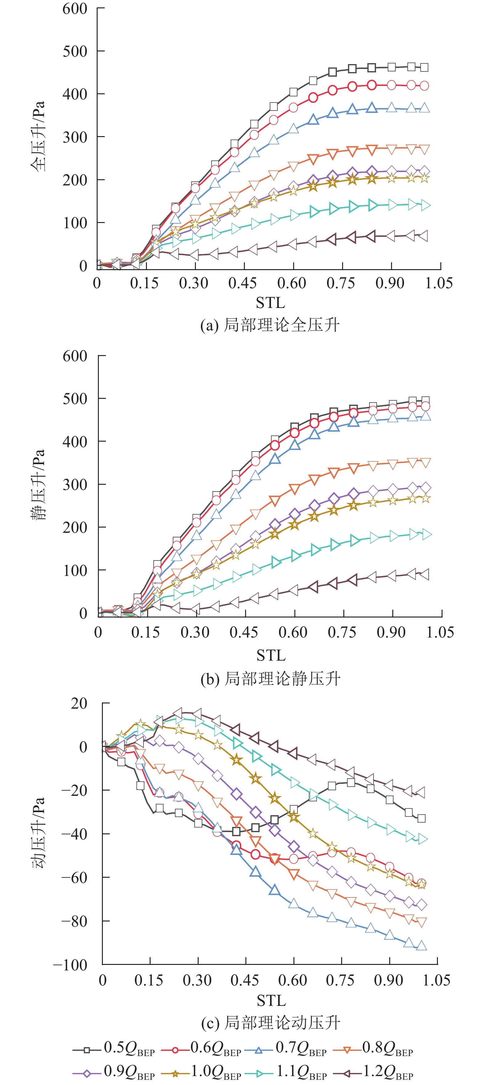 QBEP, which indicate that the low efficiency of the rear impeller is the main reason for the efficiency reduction of the fan. In the streamwise location, the flow loss of the rear impeller is concentrated within STL=0−0.3 (STL represents the dimensionless distance from the inlet to outlet of the impeller in the flow direction), and reducing the flow loss in this region is the key to improve the efficiency of rear impeller. The hump characteristic of actual total pressure rise curve is the result of the combined effect of theory total pressure rise and flow loss, but mainly related to the theory total pressure rise at the outlet of front impeller and inlet of rear impeller. The sharp decrease or increase in flow angle at the spanwise direction is the main cause of a significant decrease in axial velocity, which in turn leads to backflow in the inlet and outlet of the front impeller and inlet of the rear impeller within SPN=0.8−1.0 (SPN represents the dimensionless distance from the hub to shroud of the impeller in the spanwise direction), and ultimately affects the theory total pressure rise in impeller. Therefore, the flow angle and axial velocity jointly affect the energy evolution law in impeller. The local theory total pressure rise is greatly improved in the middle region of the impeller, while the change in the inlet and outlet region is negligible. The significant increase growth rate of local theory total pressure rise is the key factor determining the theory total pressure rise of the impeller.