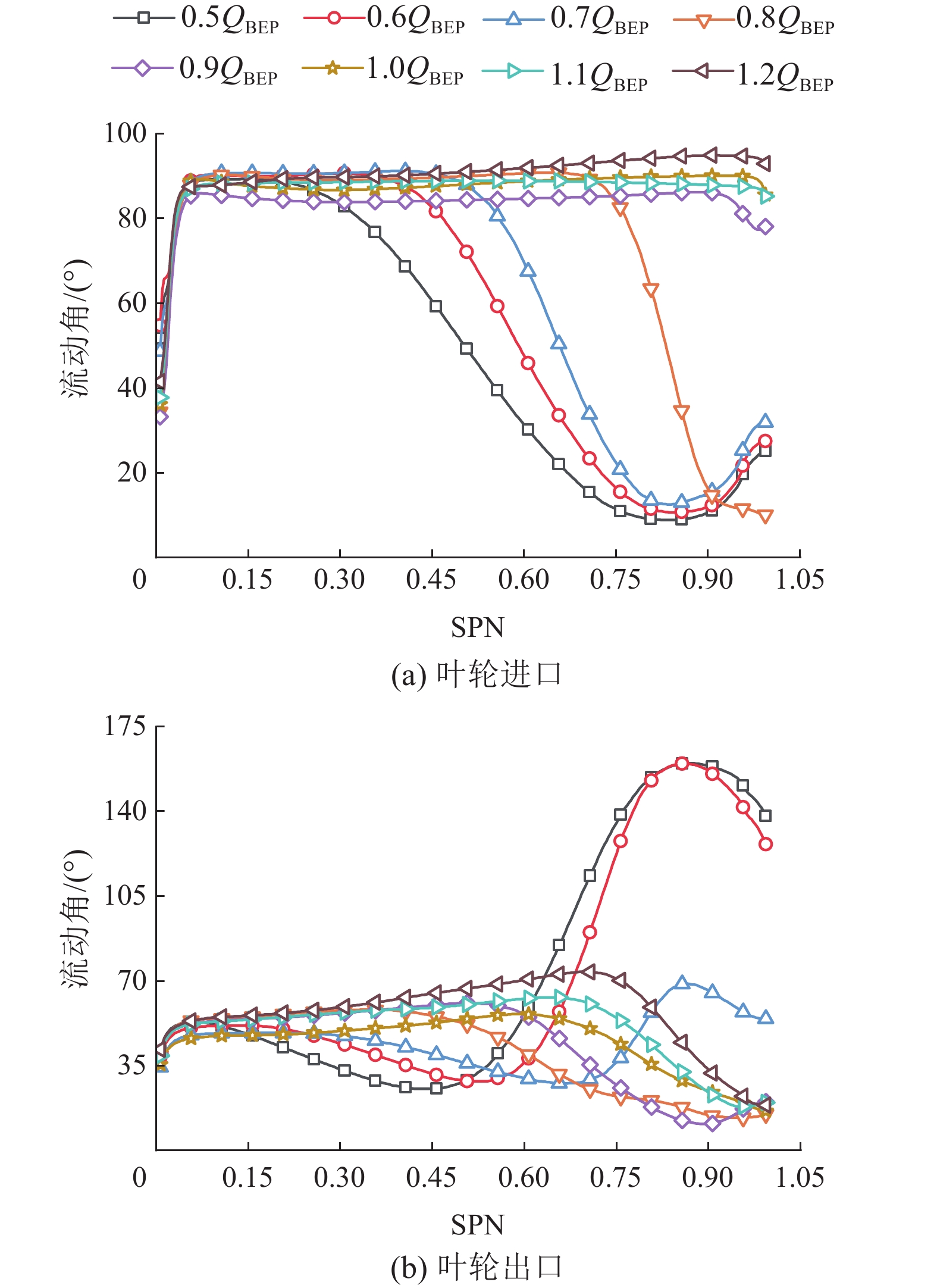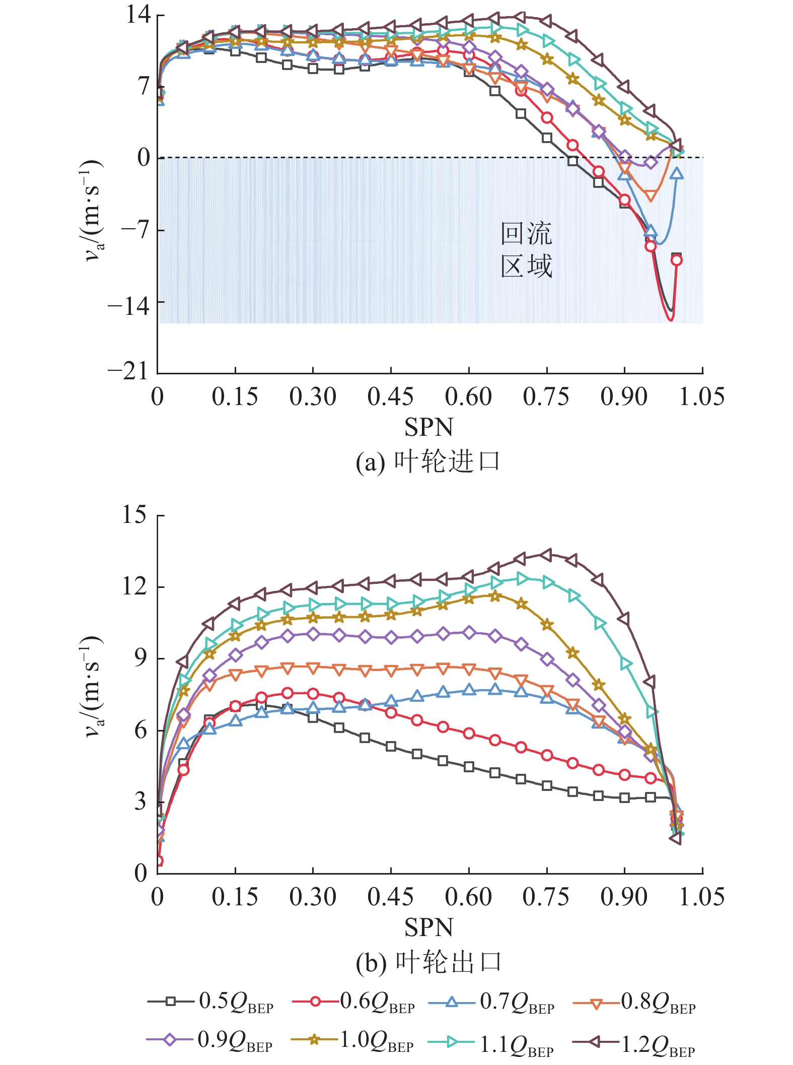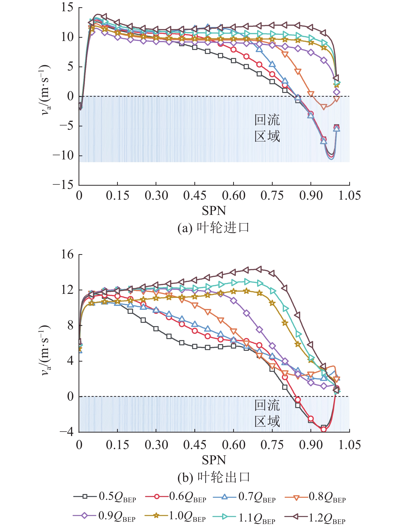 QBEP, which indicate that the low efficiency of the rear impeller is the main reason for the efficiency reduction of the fan. In the streamwise location, the flow loss of the rear impeller is concentrated within STL=0−0.3 (STL represents the dimensionless distance from the inlet to outlet of the impeller in the flow direction), and reducing the flow loss in this region is the key to improve the efficiency of rear impeller. The hump characteristic of actual total pressure rise curve is the result of the combined effect of theory total pressure rise and flow loss, but mainly related to the theory total pressure rise at the outlet of front impeller and inlet of rear impeller. The sharp decrease or increase in flow angle at the spanwise direction is the main cause of a significant decrease in axial velocity, which in turn leads to backflow in the inlet and outlet of the front impeller and inlet of the rear impeller within SPN=0.8−1.0 (SPN represents the dimensionless distance from the hub to shroud of the impeller in the spanwise direction), and ultimately affects the theory total pressure rise in impeller. Therefore, the flow angle and axial velocity jointly affect the energy evolution law in impeller. The local theory total pressure rise is greatly improved in the middle region of the impeller, while the change in the inlet and outlet region is negligible. The significant increase growth rate of local theory total pressure rise is the key factor determining the theory total pressure rise of the impeller.