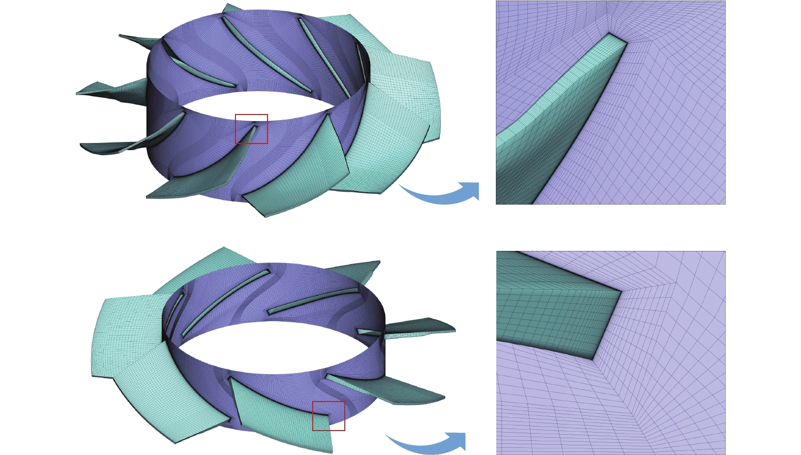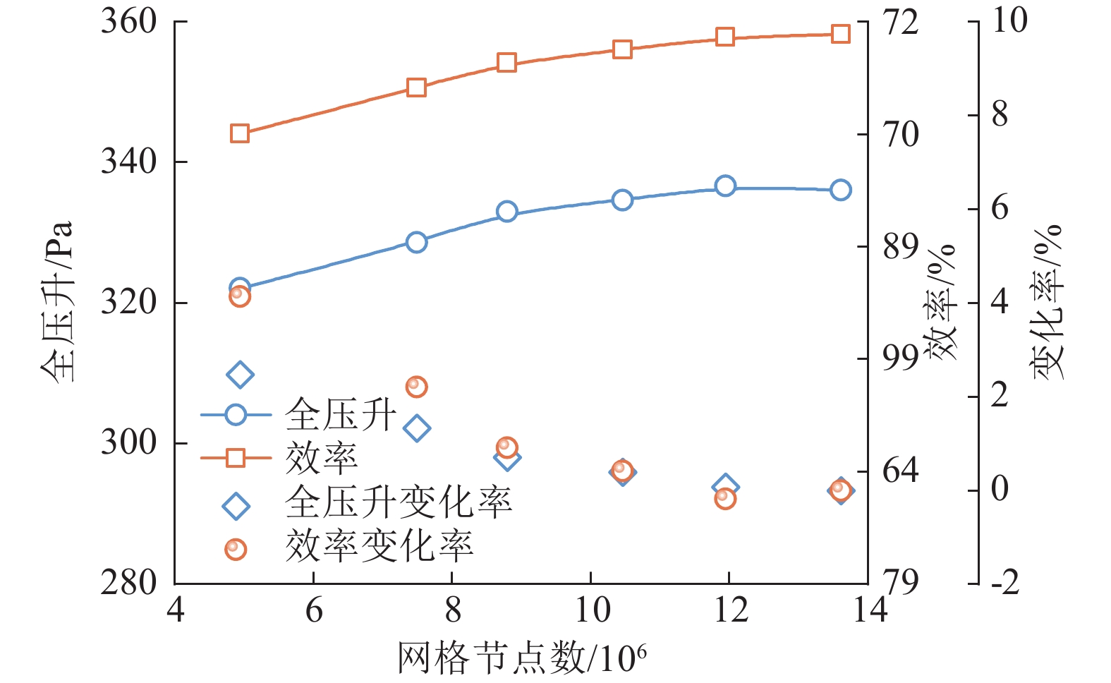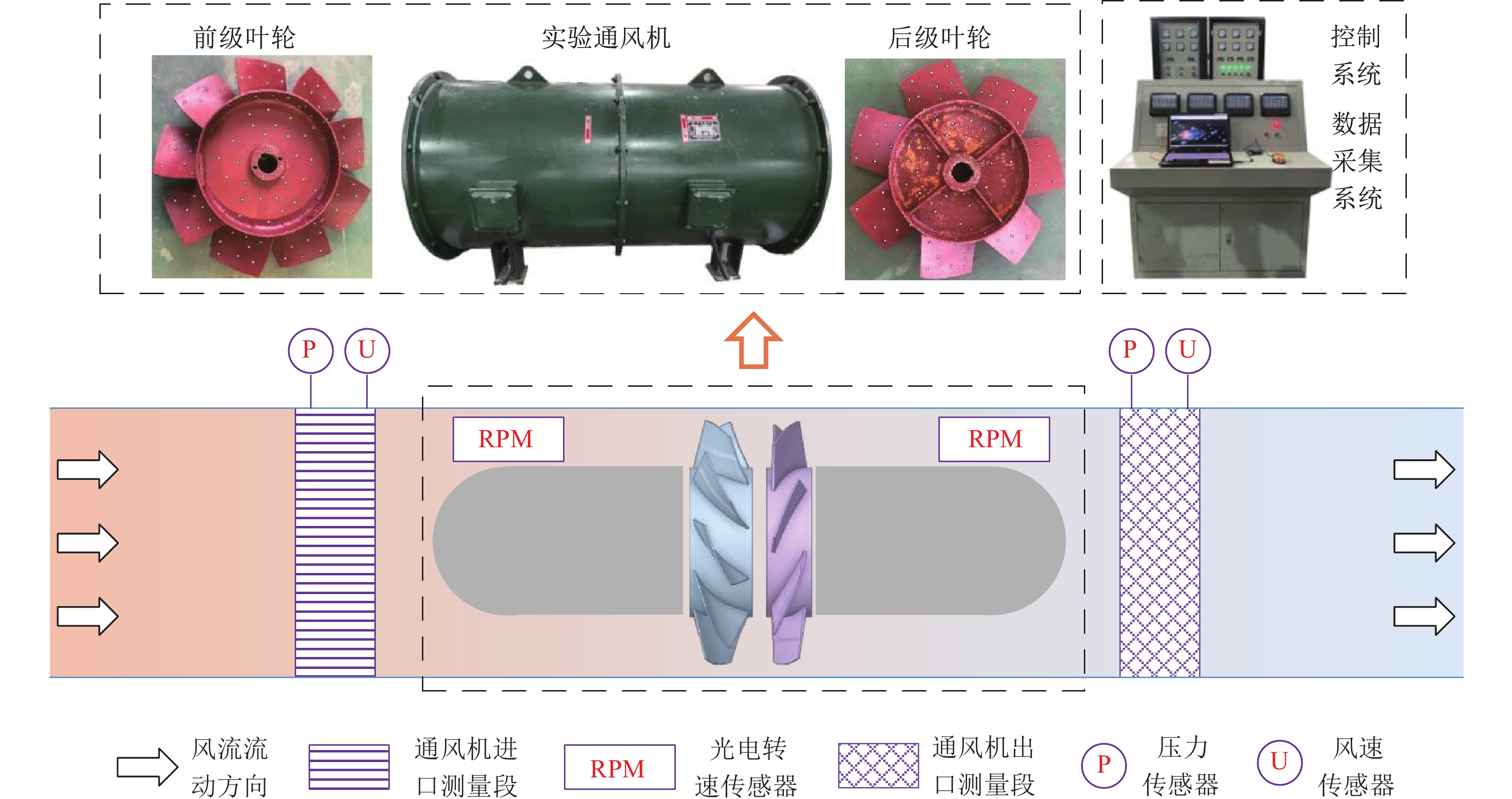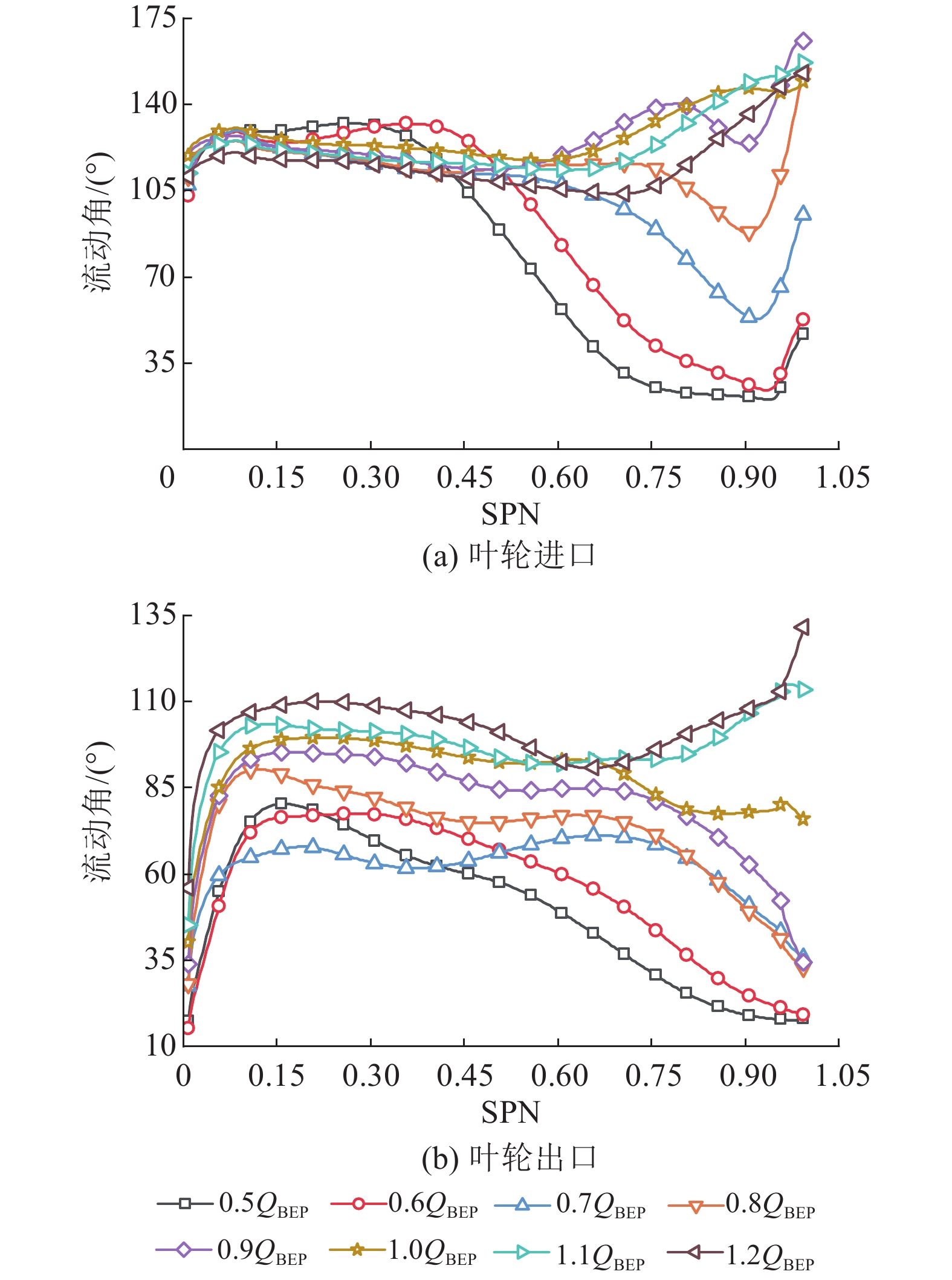 QBEP, which indicate that the low efficiency of the rear impeller is the main reason for the efficiency reduction of the fan. In the streamwise location, the flow loss of the rear impeller is concentrated within STL=0−0.3 (STL represents the dimensionless distance from the inlet to outlet of the impeller in the flow direction), and reducing the flow loss in this region is the key to improve the efficiency of rear impeller. The hump characteristic of actual total pressure rise curve is the result of the combined effect of theory total pressure rise and flow loss, but mainly related to the theory total pressure rise at the outlet of front impeller and inlet of rear impeller. The sharp decrease or increase in flow angle at the spanwise direction is the main cause of a significant decrease in axial velocity, which in turn leads to backflow in the inlet and outlet of the front impeller and inlet of the rear impeller within SPN=0.8−1.0 (SPN represents the dimensionless distance from the hub to shroud of the impeller in the spanwise direction), and ultimately affects the theory total pressure rise in impeller. Therefore, the flow angle and axial velocity jointly affect the energy evolution law in impeller. The local theory total pressure rise is greatly improved in the middle region of the impeller, while the change in the inlet and outlet region is negligible. The significant increase growth rate of local theory total pressure rise is the key factor determining the theory total pressure rise of the impeller.