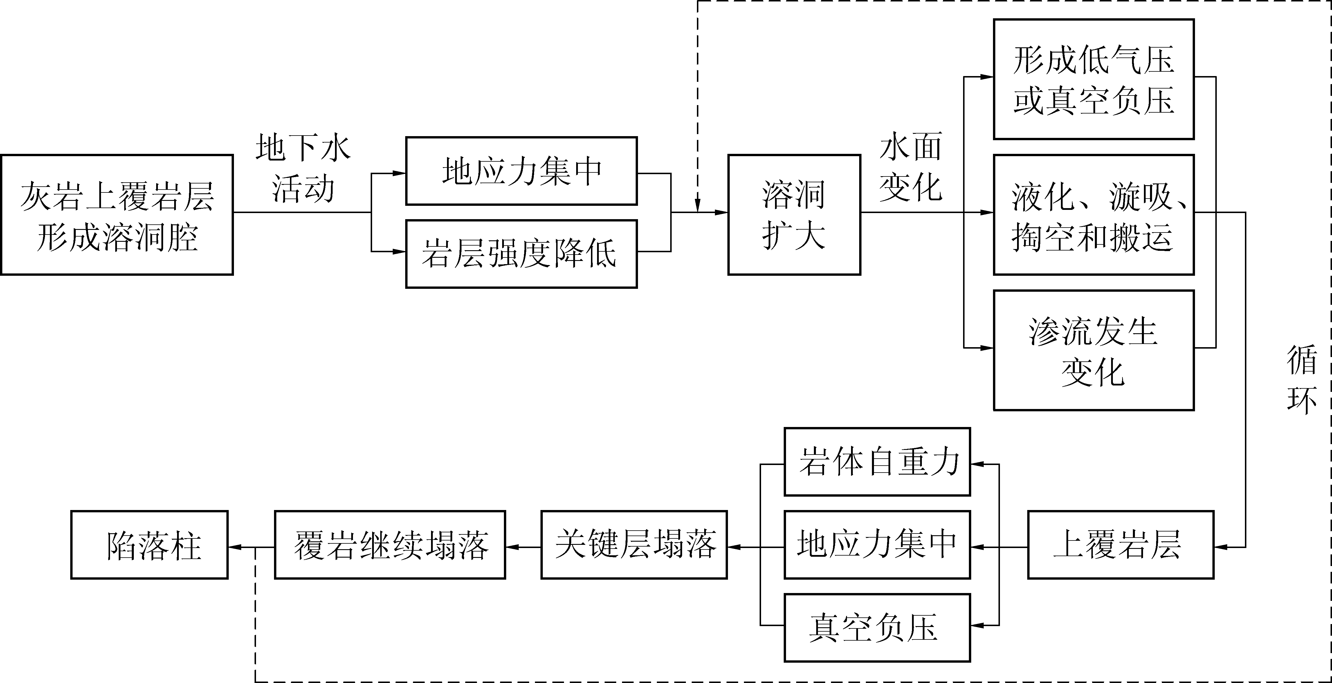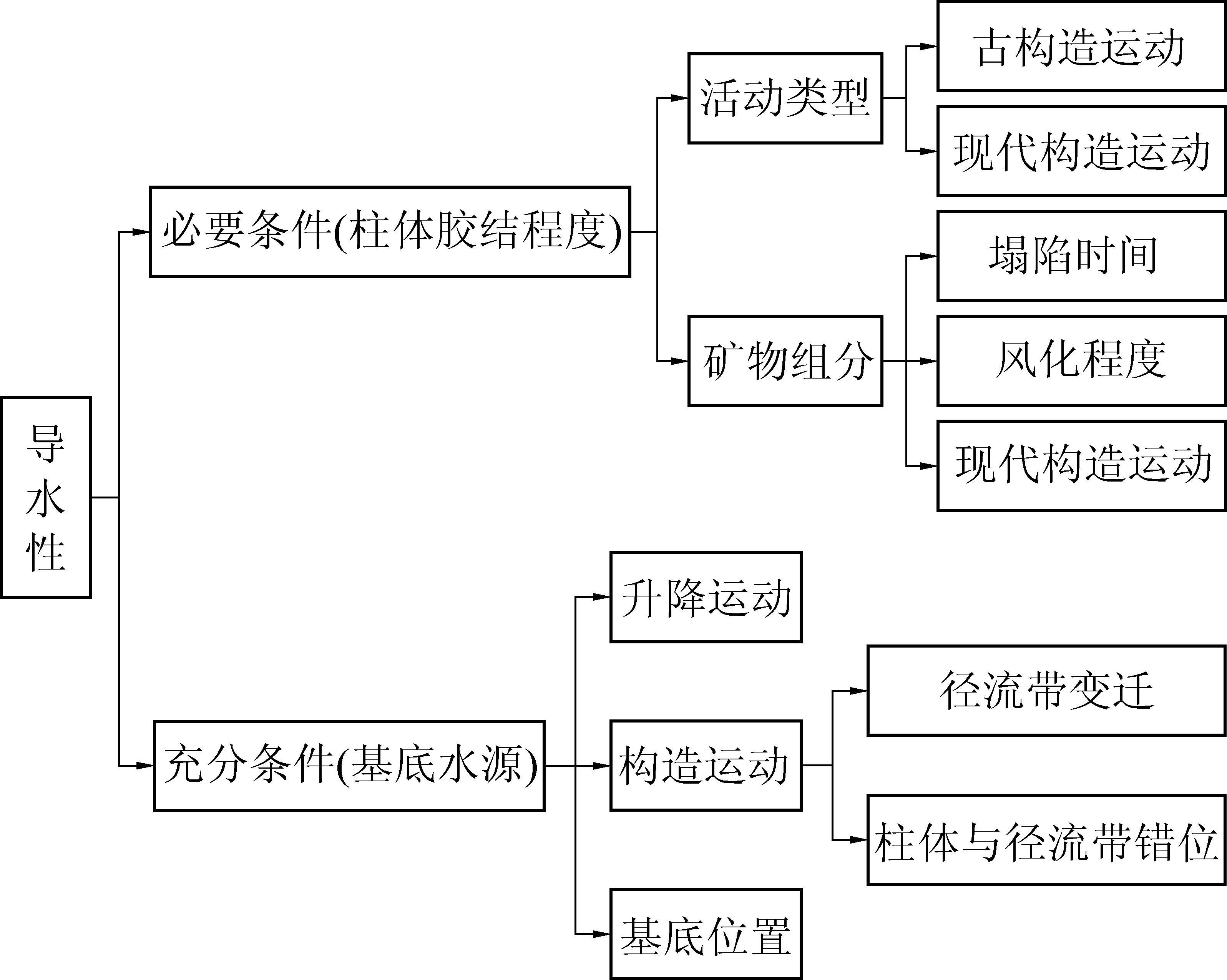上述2种观点均有失偏颇,事实上,岩溶径流带的空洞和地下水,是陷落柱形成的基础,没有灰岩中的空洞,上覆煤系地层就失去垮落的空间,自然无法形成陷落柱,因此,岩溶径流带是陷落柱形成的必要条件;而即使存在径流带,也并不是其上都发育陷落柱,而是在适当构造条件恰当配合时,在适当位置形成陷落柱,也就是说,没有构造配合也无法形成陷落柱,由此说明构造是陷落柱形成的充分条件,此外,区域构造还控制灰岩的展布以及岩溶径流带的分布,从这个意义上讲,构造控制陷落柱形成也不为过。所以,陷落柱是必要和充分条件密切配合的产物,二者有机统一,割裂二者关联,盲目夸大任何一方的观点都不科学。
