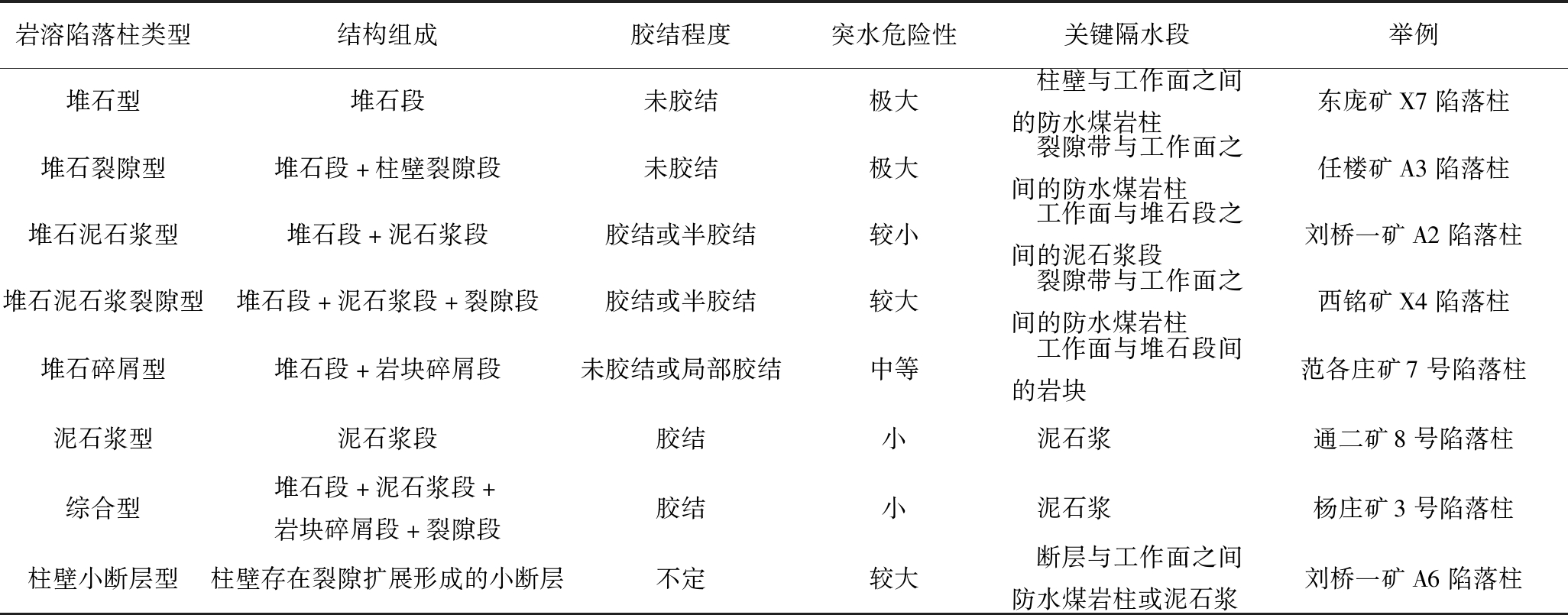 岩溶陷落柱类型结构组成胶结程度突水危险性关键隔水段举例堆石型堆石段未胶结极大 柱壁与工作面之间的防水煤岩柱东庞矿X7陷落柱堆石裂隙型堆石段+柱壁裂隙段未胶结极大 裂隙带与工作面之间的防水煤岩柱任楼矿A3陷落柱堆石泥石浆型堆石段+泥石浆段胶结或半胶结较小 工作面与堆石段之间的泥石浆段刘桥一矿A2陷落柱堆石泥石浆裂隙型堆石段+泥石浆段+裂隙段胶结或半胶结较大 裂隙带与工作面之间的防水煤岩柱西铭矿X4陷落柱堆石碎屑型堆石段+岩块碎屑段未胶结或局部胶结中等 工作面与堆石段间的岩块范各庄矿7号陷落柱泥石浆型泥石浆段胶结小 泥石浆通二矿8号陷落柱综合型堆石段+泥石浆段+岩块碎屑段+裂隙段胶结小 泥石浆杨庄矿3号陷落柱柱壁小断层型柱壁存在裂隙扩展形成的小断层不定较大 断层与工作面之间防水煤岩柱或泥石浆刘桥一矿A6陷落柱