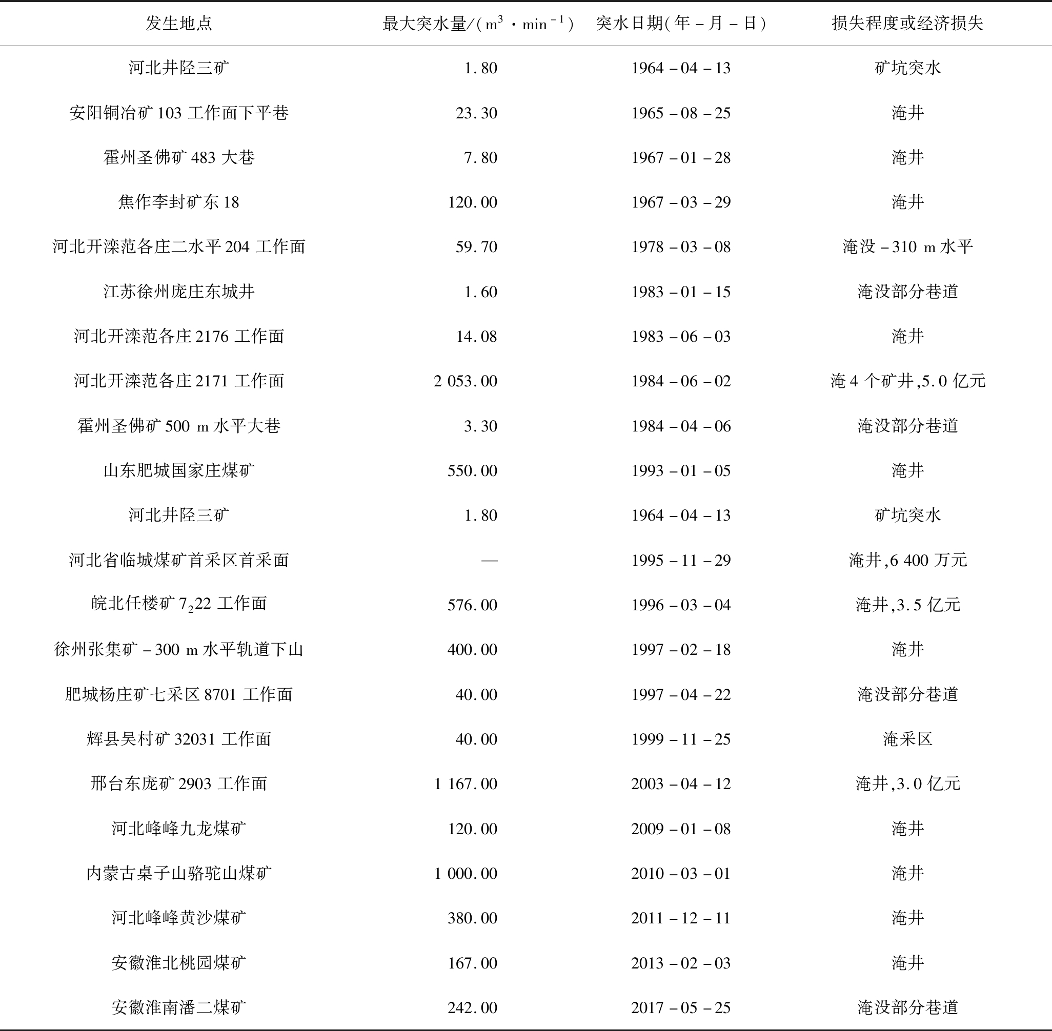 发生地点最大突水量/(m3·min-1)突水日期(年-月-日)损失程度或经济损失河北井陉三矿1.801964-04-13矿坑突水安阳铜冶矿103工作面下平巷23.301965-08-25淹井霍州圣佛矿483大巷7.801967-01-28淹井焦作李封矿东18120.001967-03-29淹井河北开滦范各庄二水平204工作面59.701978-03-08淹没-310m水平江苏徐州庞庄东城井1.601983-01-15淹没部分巷道河北开滦范各庄2176工作面14.081983-06-03淹井河北开滦范各庄2171工作面2053.001984-06-02淹4个矿井,5.0亿元霍州圣佛矿500m水平大巷3.301984-04-06淹没部分巷道山东肥城国家庄煤矿550.001993-01-05淹井河北井陉三矿1.801964-04-13矿坑突水河北省临城煤矿首采区首采面—1995-11-29淹井,6400万元皖北任楼矿7222工作面576.001996-03-04淹井,3.5亿元徐州张集矿-300m水平轨道下山400.001997-02-18淹井肥城杨庄矿七采区8701工作面40.001997-04-22淹没部分巷道辉县吴村矿32031工作面40.001999-11-25淹采区邢台东庞矿2903工作面1167.002003-04-12淹井,3.0亿元河北峰峰九龙煤矿120.002009-01-08淹井内蒙古桌子山骆驼山煤矿1000.002010-03-01淹井河北峰峰黄沙煤矿380.002011-12-11淹井安徽淮北桃园煤矿167.002013-02-03淹井安徽淮南潘二煤矿242.002017-05-25淹没部分巷道