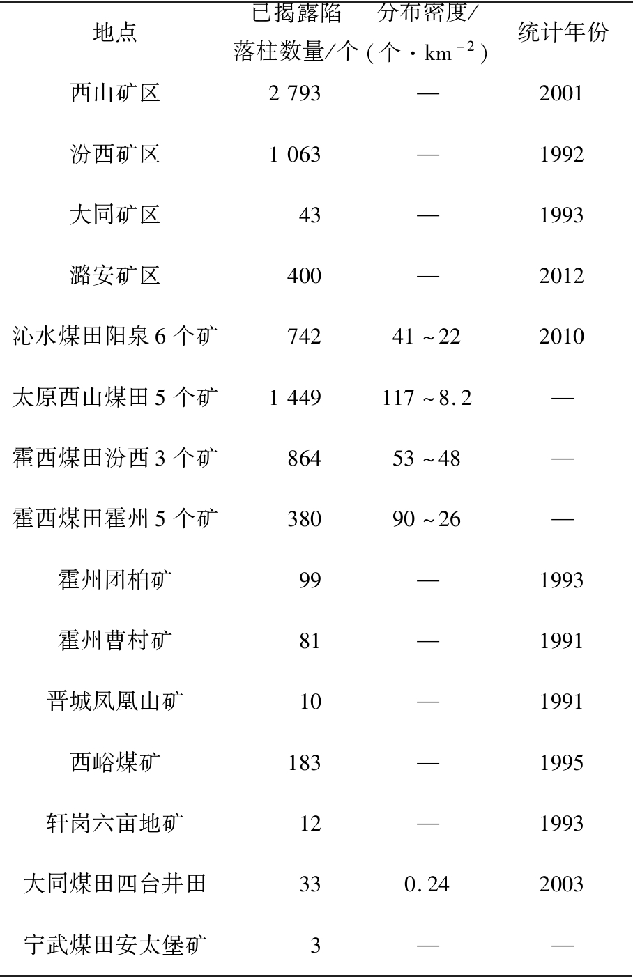 地点已揭露陷落柱数量/个分布密度/(个·km-2)统计年份西山矿区2793—2001汾西矿区1063—1992大同矿区43—1993潞安矿区400—2012沁水煤田阳泉6个矿74241~222010太原西山煤田5个矿1449117~8.2—霍西煤田汾西3个矿86453~48—霍西煤田霍州5个矿38090~26—霍州团柏矿99—1993霍州曹村矿81—1991晋城凤凰山矿10—1991西峪煤矿183—1995轩岗六亩地矿12—1993大同煤田四台井田330.242003宁武煤田安太堡矿3——