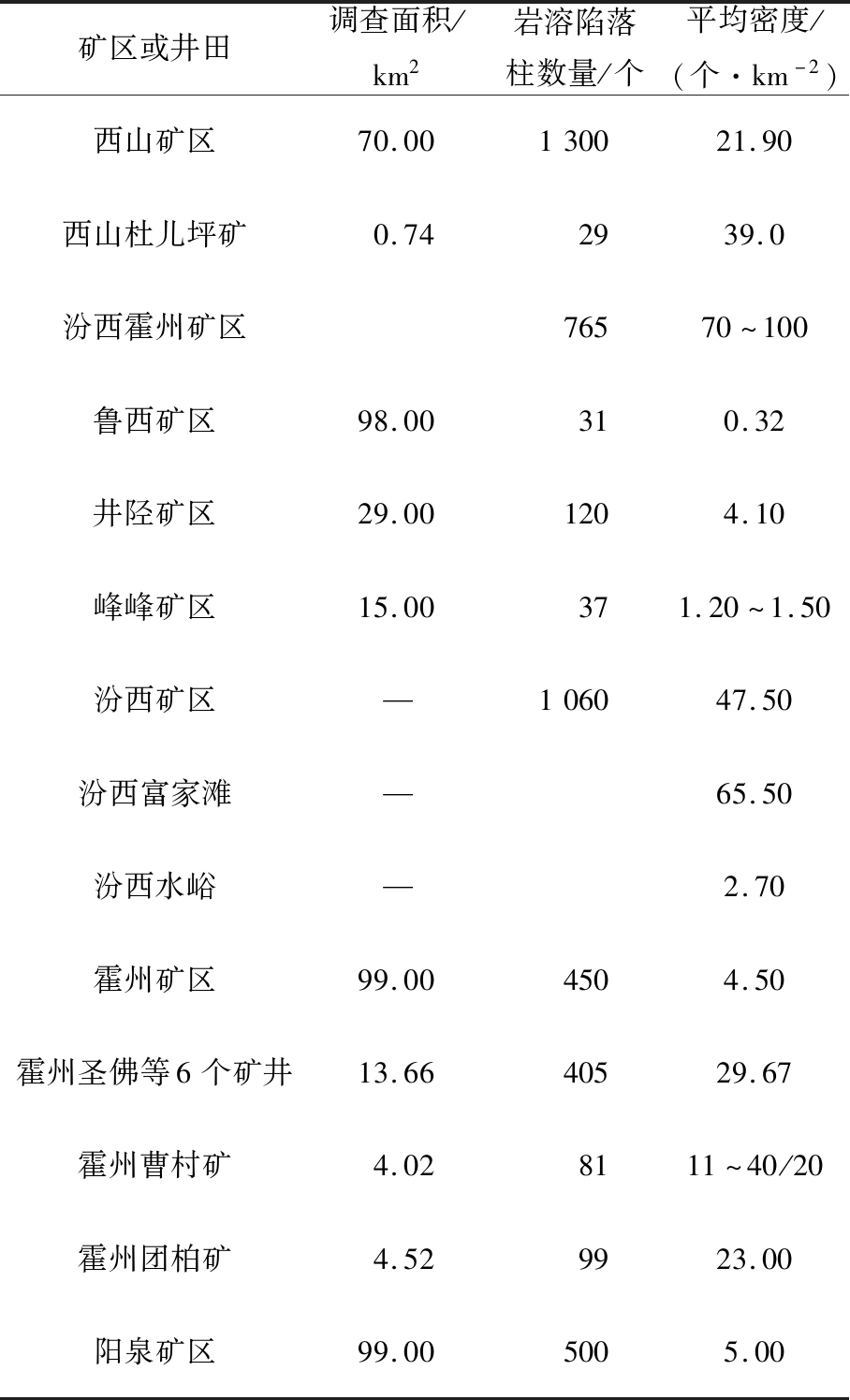 矿区或井田调查面积/km2岩溶陷落柱数量/个平均密度/(个·km-2)西山矿区70.00130021.90西山杜儿坪矿0.742939.0汾西霍州矿区76570~100鲁西矿区98.00310.32井陉矿区29.001204.10峰峰矿区15.00371.20~1.50汾西矿区—106047.50汾西富家滩—65.50汾西水峪—2.70霍州矿区99.004504.50霍州圣佛等6个矿井13.6640529.67霍州曹村矿4.028111~40/20霍州团柏矿4.529923.00阳泉矿区99.005005.00