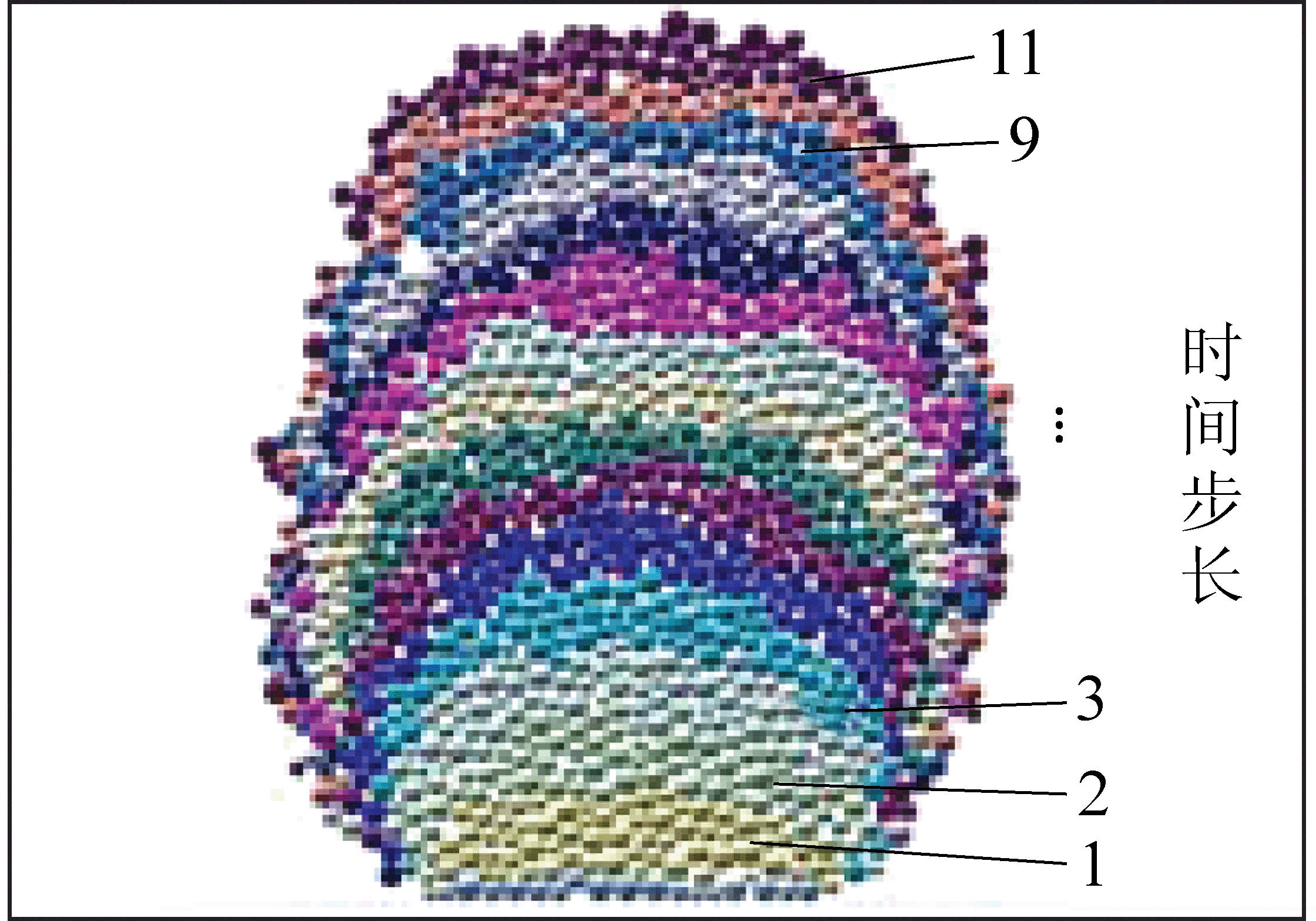 由图4可得,顶煤放出体形态近似为椭圆形,与放出体形态理论模型较为接近。模型中相同颜色标定的模型颗粒在相同时间段内放出,且在前一阶段放出体发育的基础上呈近似环状分布。
