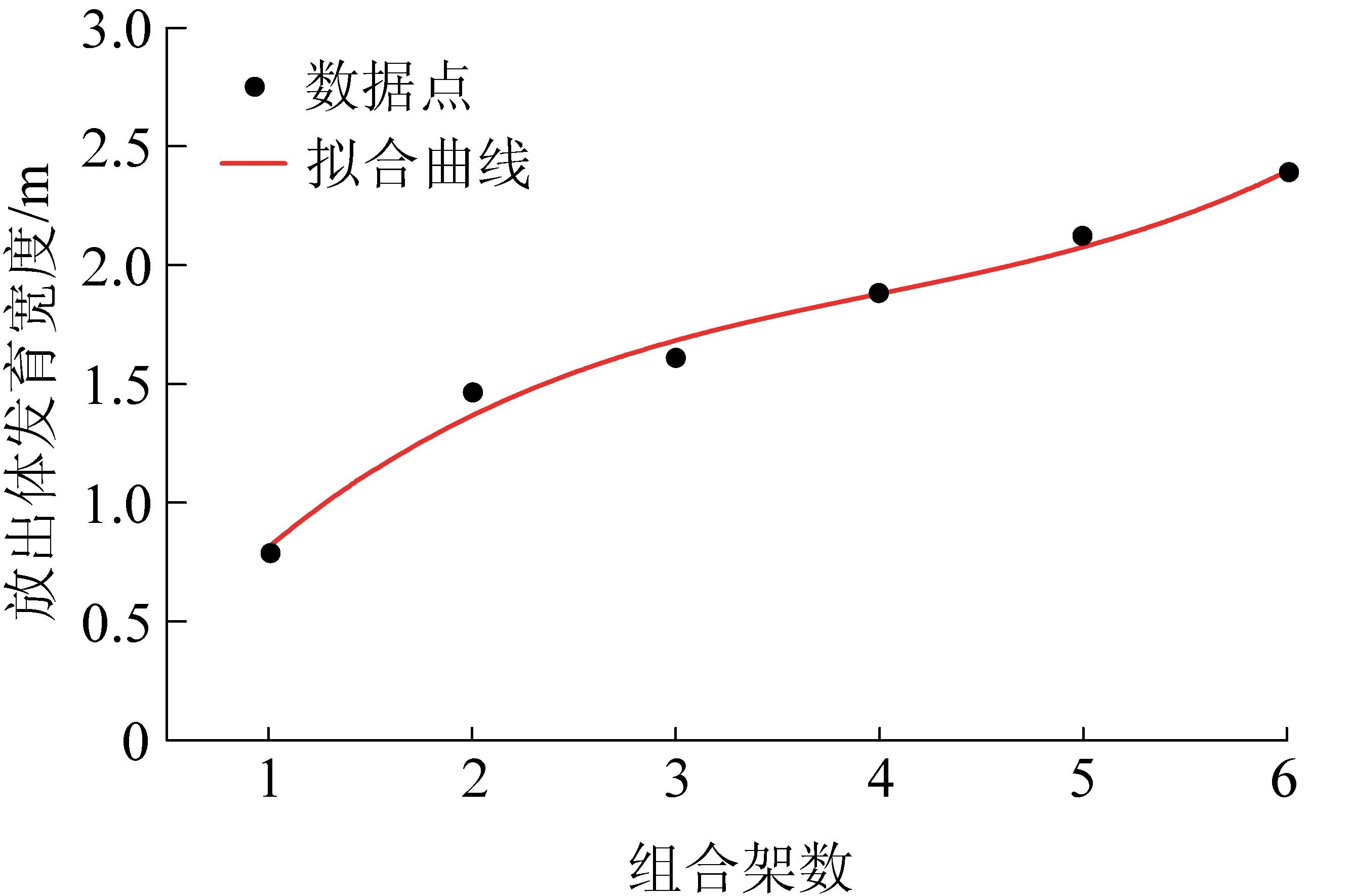 经过上述分析可得,放煤口尺寸与放出体发育范围间存在某种对应关系,通过提取支架不同组合架数放煤的放出体发育范围信息,分析放煤口尺寸对放出体发育范围的影响,因支架不同组合架数放煤是在同一模型下计算的,放煤结束后,放出体发育高度都相同,所以在此仅分析同时放煤架数与放出体发育宽度间的关系,如图6所示。