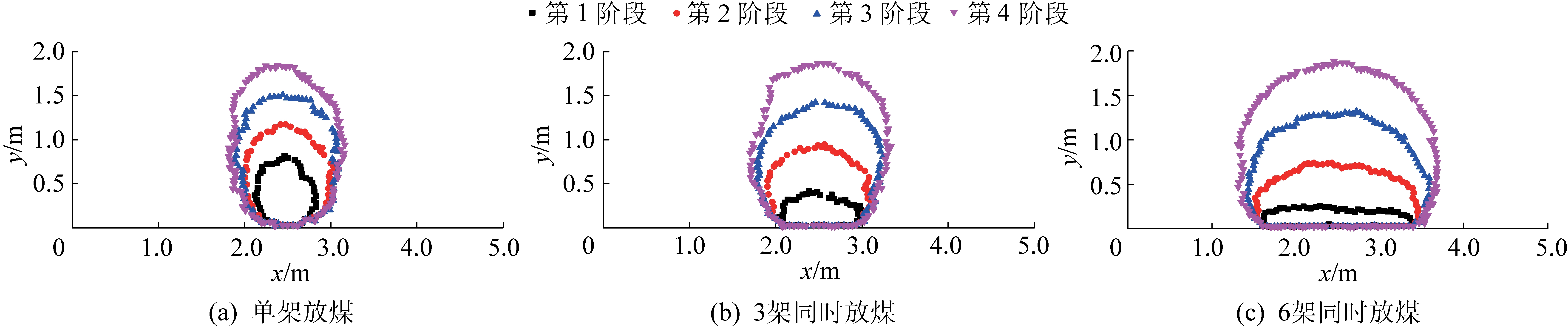 放出体发育为由放煤口向煤矸分界面呈近似环状发育的过程,经数值模拟计算,支架不同组合架数(群组)放煤,放出体发育规律虽较为接近,但又表现出差异性,选取具有说服性的单架放煤、3架同时放煤、6架同时放煤顶煤放出体发育过程为分析对象。放煤过程严格执行见矸关门操作,将不同组合架数放煤过程时步均分为4个阶段,通过提取每阶段放出体边界颗粒信息,绘制出放出体发育过程(图5)。(x,y)表示颗粒位置坐标。