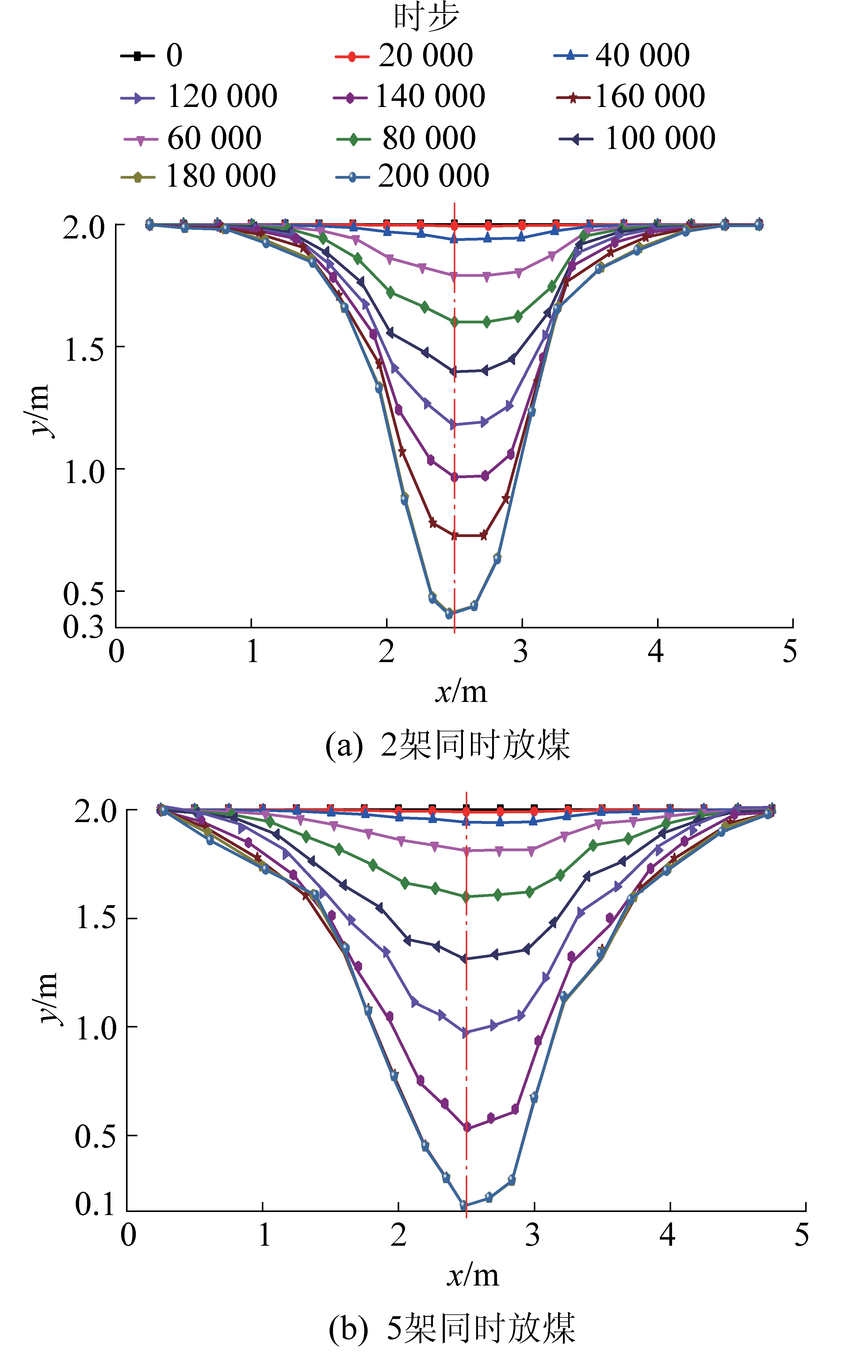 由图10可知:随放煤时步增加,受自重和上部煤岩颗粒重力作用的模型颗粒的位移和速度越来越大;同一时步,位于放煤口中心垂线附近的模型颗粒位移都远大于远离放煤口位置的模型颗粒;煤矸分界面下沉动态曲线关于放煤口中心垂线对称;与2架相比,5架同时放煤煤矸分界面下沉动态曲线达到稳定所需时间减少1/2,且影响顶煤放出范围更大。