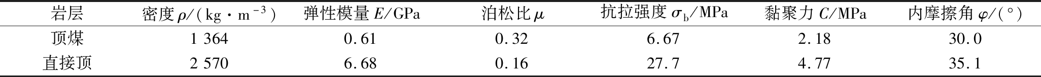 岩层密度ρ/(kg·m-3)弹性模量E/GPa泊松比μ抗拉强度σb/MPa黏聚力C/MPa内摩擦角φ/(°)顶煤13640.610.326.672.1830.0直接顶25706.680.1627.74.7735.1