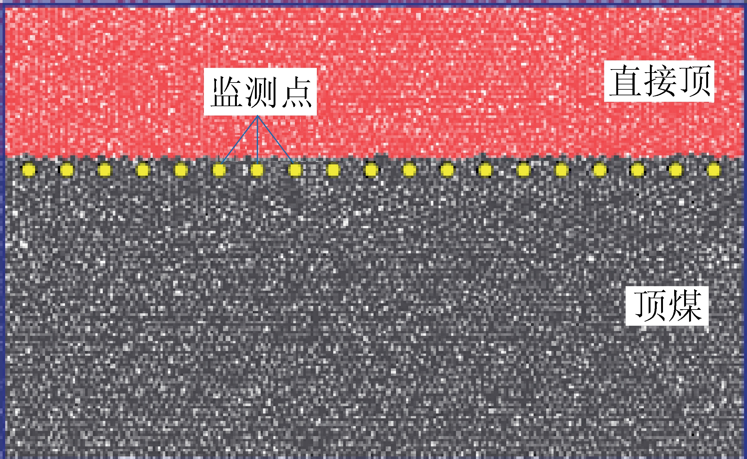 基于非连续介质力学为基础的颗粒离散元数值模拟软件(GDEM),建立特厚近水平煤层综放开采顶煤放落规律数值模型,如图3所示。依据煤层厚度及顶煤放出块度尺寸,按照1∶6比例建立数值模型,模型长×宽为5 m×3 m,模拟倾向长30 m,顶煤厚12 m,直接顶厚6 m煤层赋存条件下的顶煤放出规律;为简化模型,顶煤、直接顶模型颗粒均为相同尺寸,模型颗粒直径为50 mm。