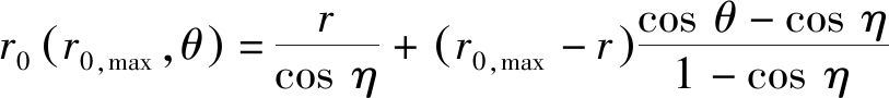 其中,r为放煤口距点放源O的垂直距离,m;ar(θ)为任意位置模型颗粒的加速度,m/s2;r0,max为模型颗粒放出体边界最远点距点放源的距离,m;r0(r0,max,θ)为模型颗粒放出体边界上任意位置距点放源的距离,m。根据公式(3),可反演出放出体形态理论模型,其中φ=30°,η=30°,r=0.5 m,放出体形态理论模型如图2所示。