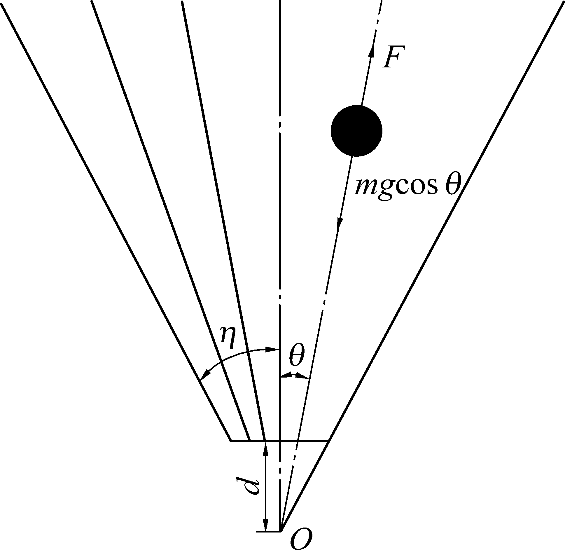 图1中,m为模型颗粒质量;g为重力加速度;θ为模型颗粒移动放出轨迹与垂直方向的夹角;模型颗粒从起始放煤至放煤结束,始终受自身重力沿运移轨迹的分力mgcos θ;η为模型颗粒能够下移的最大角度,其与内摩擦角φ间的关系为: