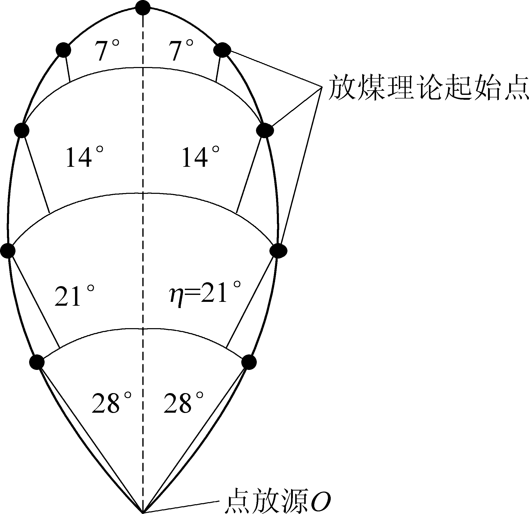 散体顶煤模型颗粒放出边界上的初始点距点放源O的距离为[23-24]