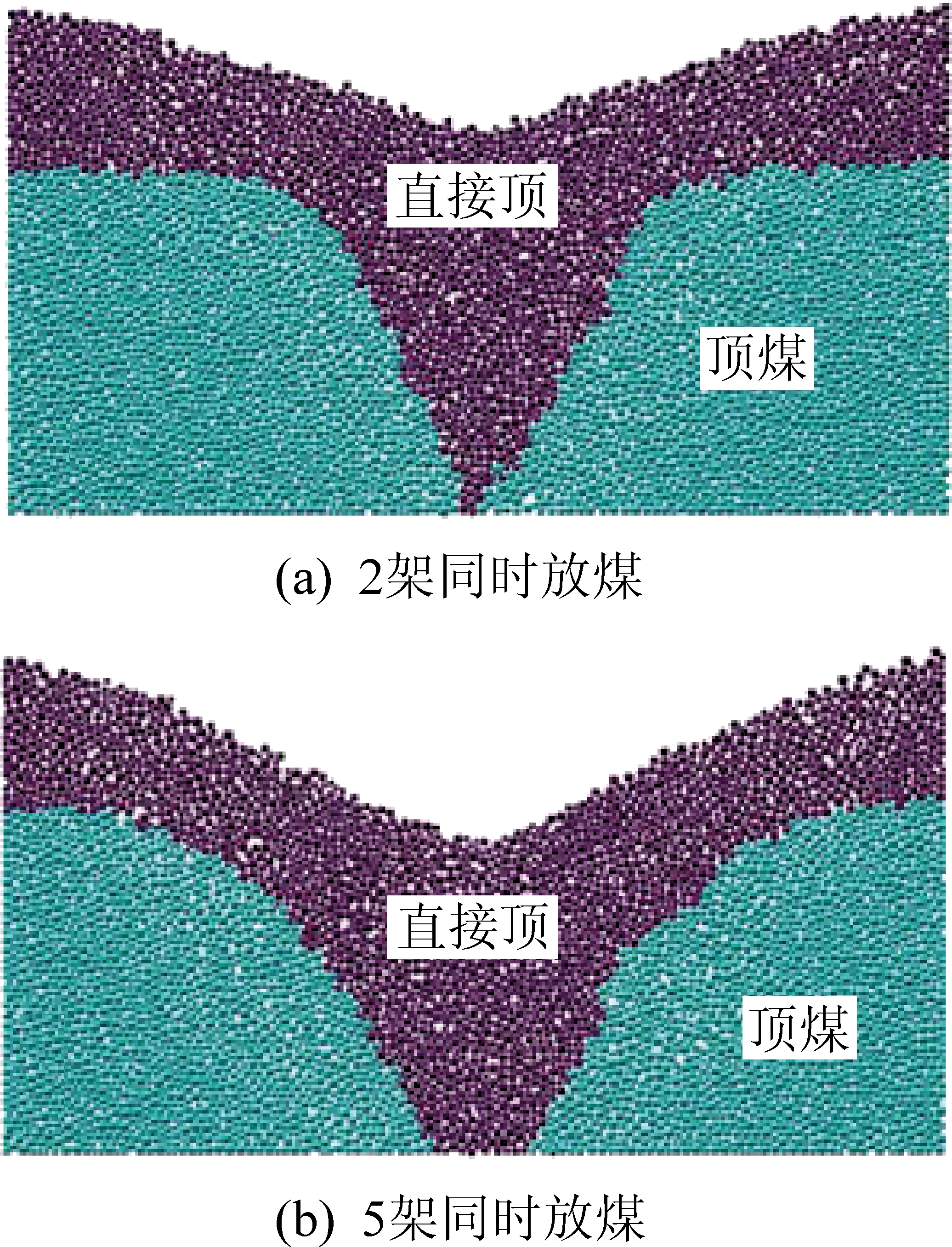 放煤结束后的煤矸分界面特征反映了煤岩散体的流动特性,同时放煤漏斗形态也间接体现了顶煤放出的体积,为说明支架不同组合架数放煤方式下,煤矸分界面特征的差异性,展示具有说服性的2架同时放煤和5架同时放煤的煤矸分界面,如图9所示。