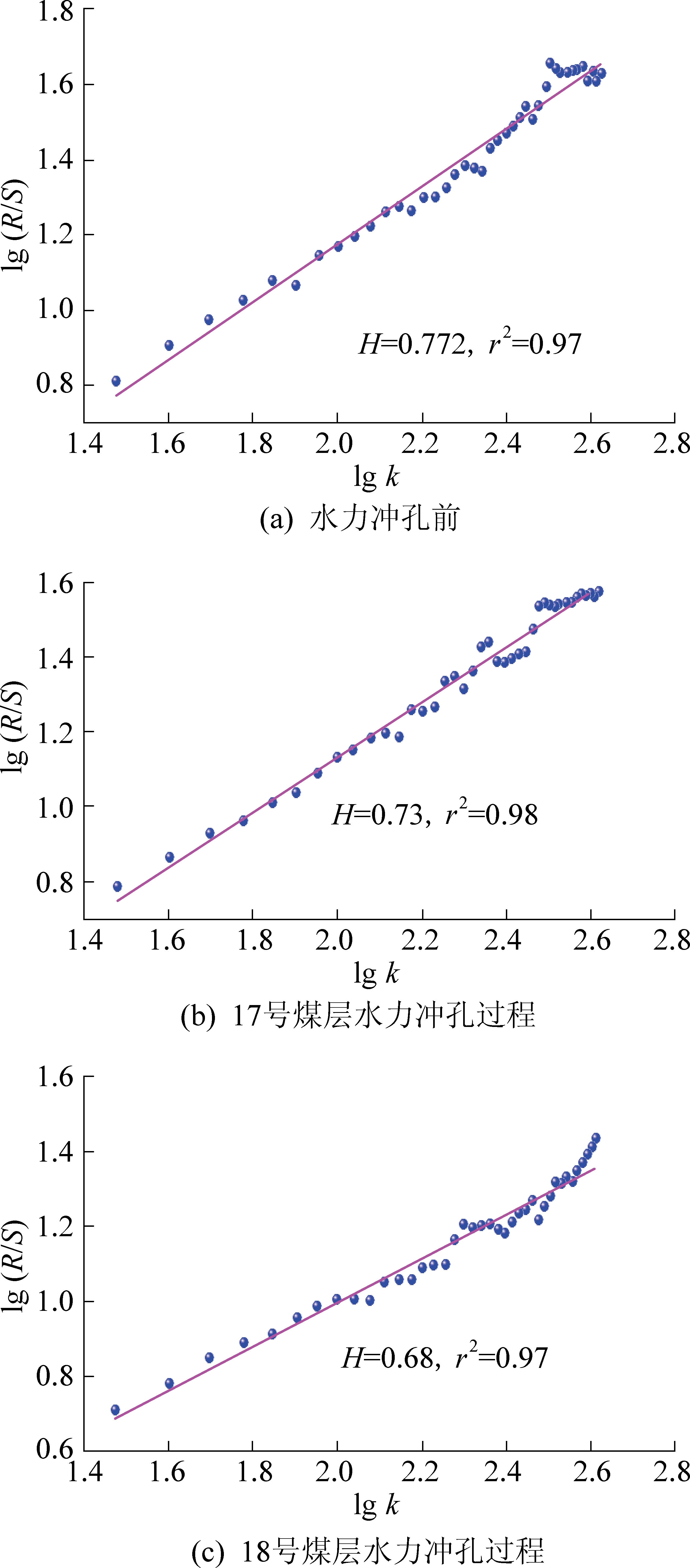 因此,该直线的斜率就是赫斯特指数H,其中b表示直线在lg k轴上的截距。当1>H>1/2时,所研究的时间序列与未来的增量成正相关,且随着时间的推移在不断增加;当1/2>H>0时,所研究的时间序列与未来的增量成负相关,且随着时间推移在不断减小。基于这些特征,王恩元等[17]研究了煤体电磁辐射信号也符合R/S统计规律,该研究结果被用于煤岩动力灾害的预测预报。水力冲孔期间的电磁辐射信号的赫斯特统计规律和R/S分析结果,如图5所示。