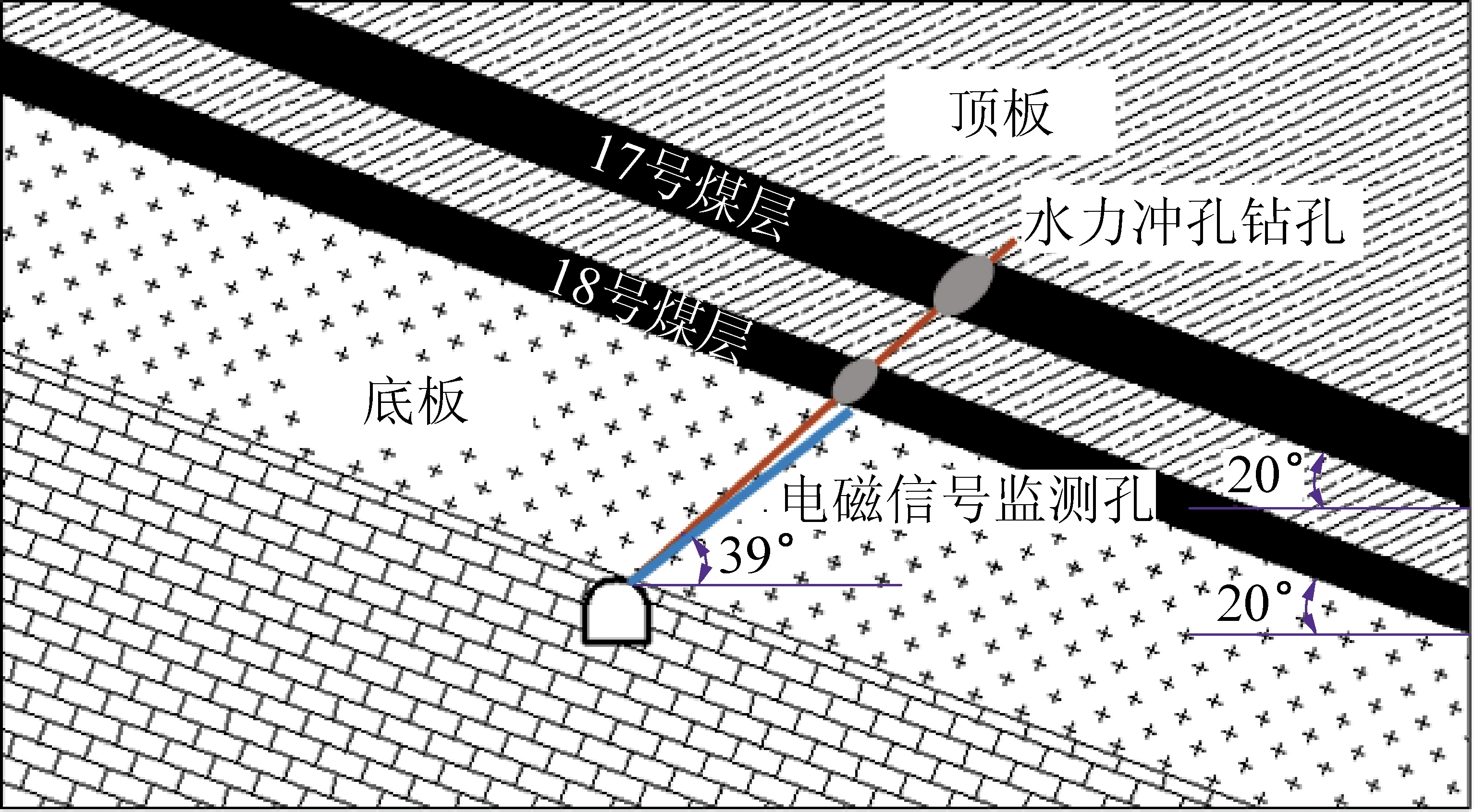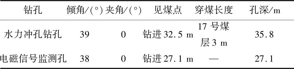 钻孔倾角/(°)夹角/(°)见煤点穿煤长度孔深/m水力冲孔钻孔390钻进32.5m17号煤层3m35.8电磁信号监测孔380钻进27.1m—27.1