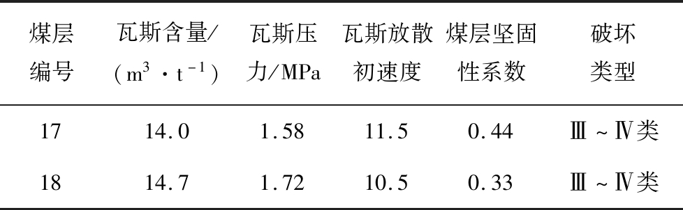 煤层编号瓦斯含量/(m3·t-1)瓦斯压力/MPa瓦斯放散初速度煤层坚固性系数破坏类型1714.01.5811.50.44Ⅲ~Ⅳ类1814.71.7210.50.33Ⅲ~Ⅳ类