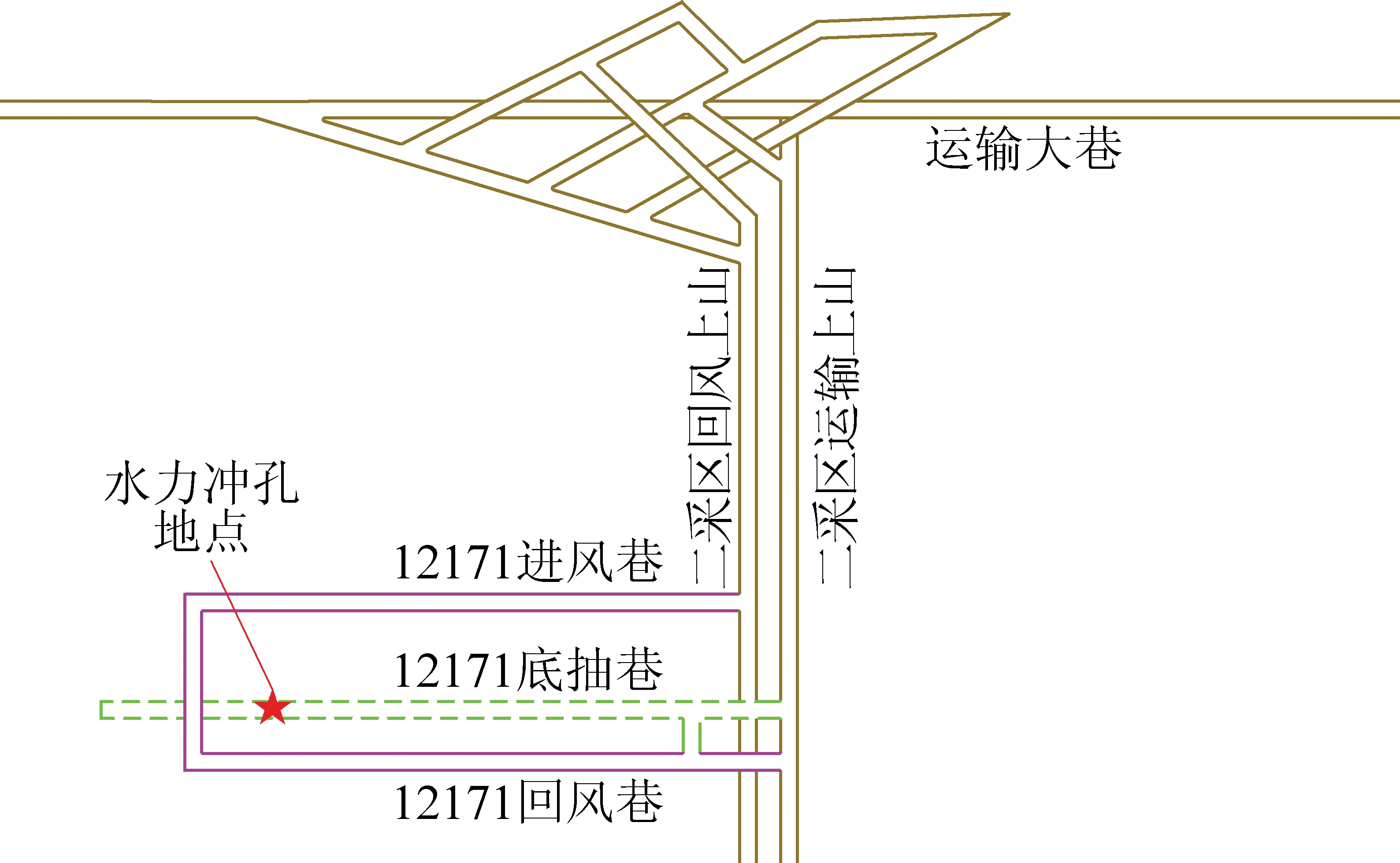 本次试验选择在松河煤矿二采区内,在12171运输底抽巷施工穿层抽采钻孔,一次性穿过17、18号煤层,并对12171运输巷掘进条带煤层实施水力冲孔卸压增透措施,考虑17、18号煤层属近距离煤层,需同时抽采瓦斯、同时消突,施工时也对18号煤层实施水力冲孔卸压增透措施。冲孔施工位置如图1所示。