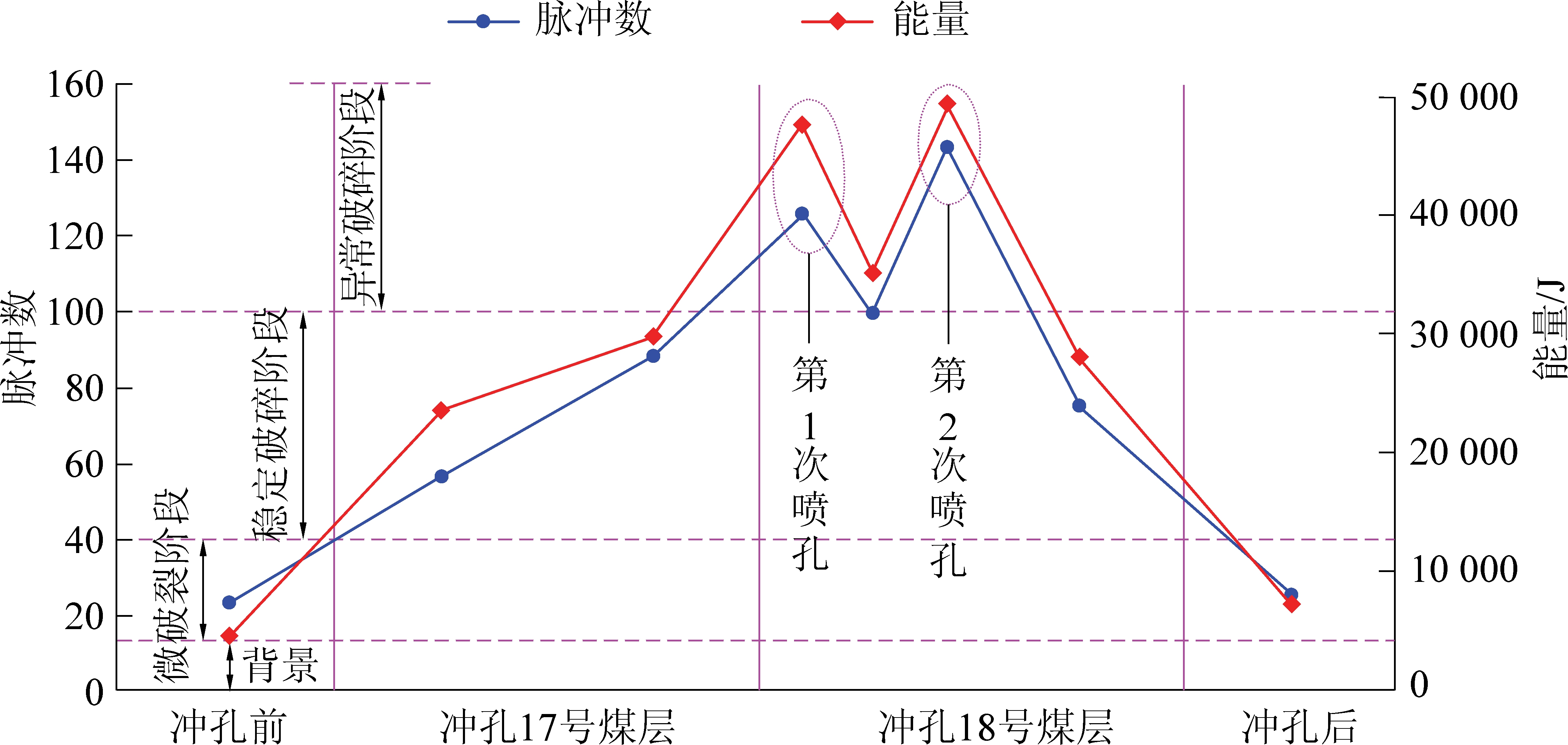 冲孔开始后,先对17号煤层进行水力冲孔,电磁辐射各信号指标如图4b所示。在刚开始阶段脉冲数、能量都出现上升阶段,表明在此时间段内,煤体内部在高压水射流的作用下出现挤压、滑移直至破裂,且随着时间的推移,这种煤体受载破裂显现越来越明显,电磁辐射脉冲数、能量变化均出现同步变化。在监测的时间窗口后期,各电磁辐射信号指标基本表现稳定,其中脉冲数在60~80;能量在26 000~27 000 J,2项指标的变化规律均表现出良好的类似