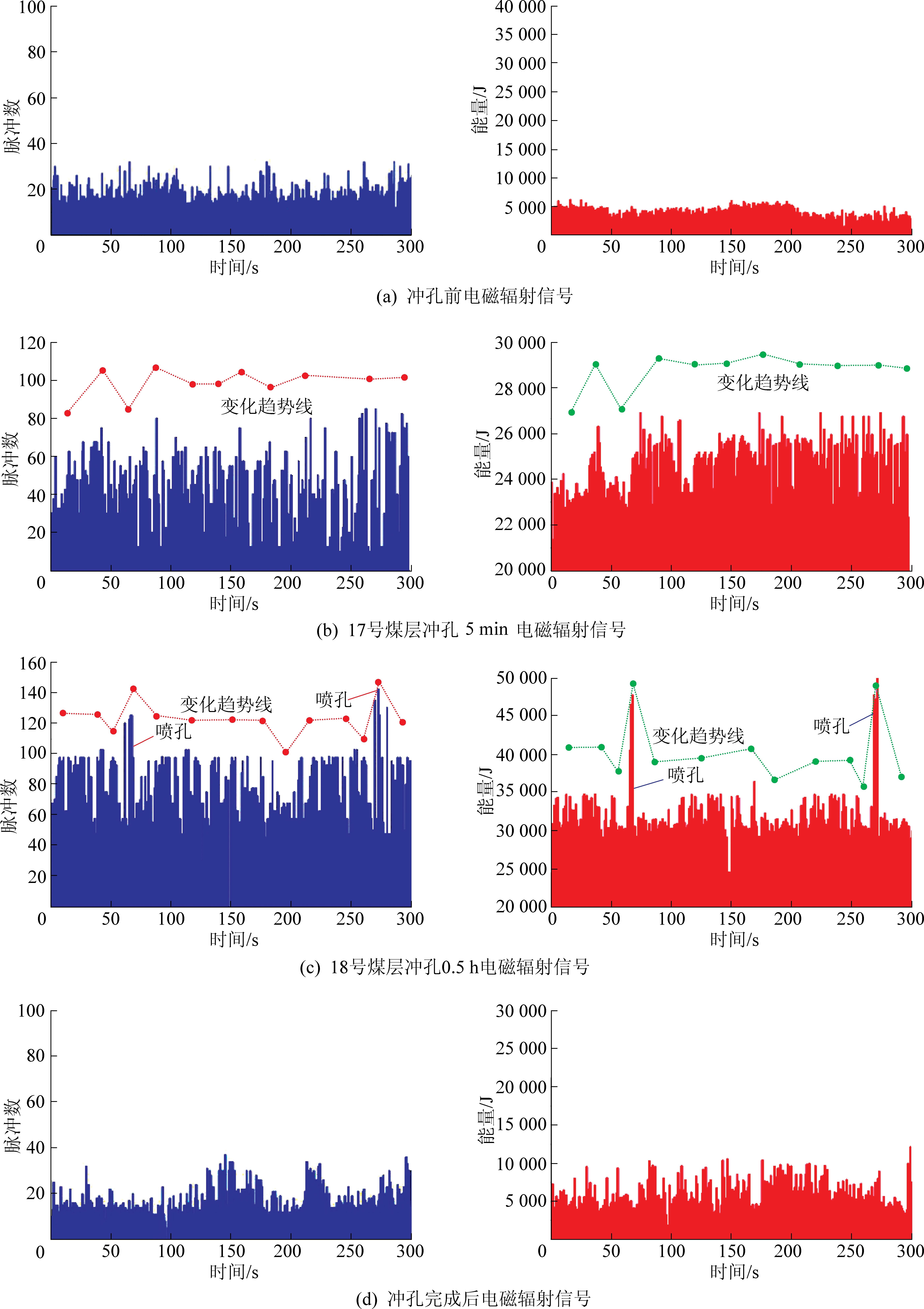 水力冲孔持续时间为2 h,前一个小时冲孔17号煤层,后一个小时冲孔18号煤层,YDD16矿用本安型煤岩动力灾害监测仪使用电池供电,在水力冲孔前、水力冲孔过程中共进行了8次电磁辐射信号监测,每次监测时间为300 s,在18号煤层冲孔开始0.5 h左右出现了2次瓦斯喷孔现象,成功采集到喷孔前后电磁辐射信号。水力冲孔之前、17号煤层水力冲孔开始5 min、18号煤层冲孔0.5 h,水力冲孔完成后4个时间段内电磁辐射信号测试结果如图4所示。