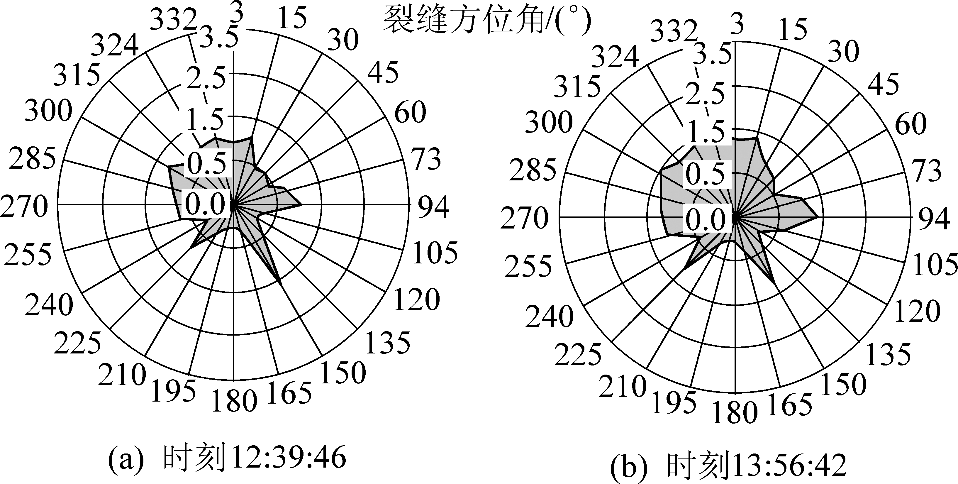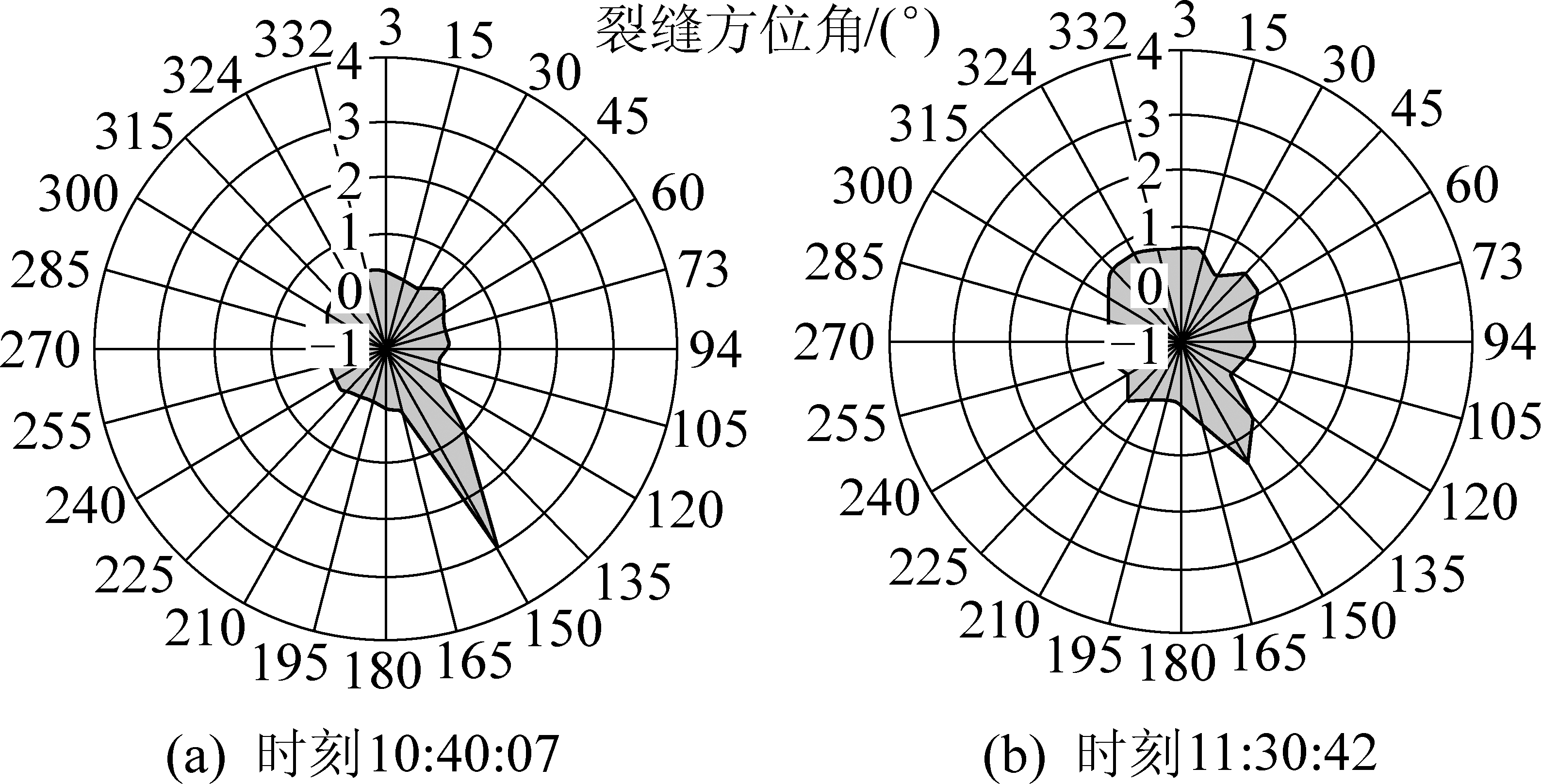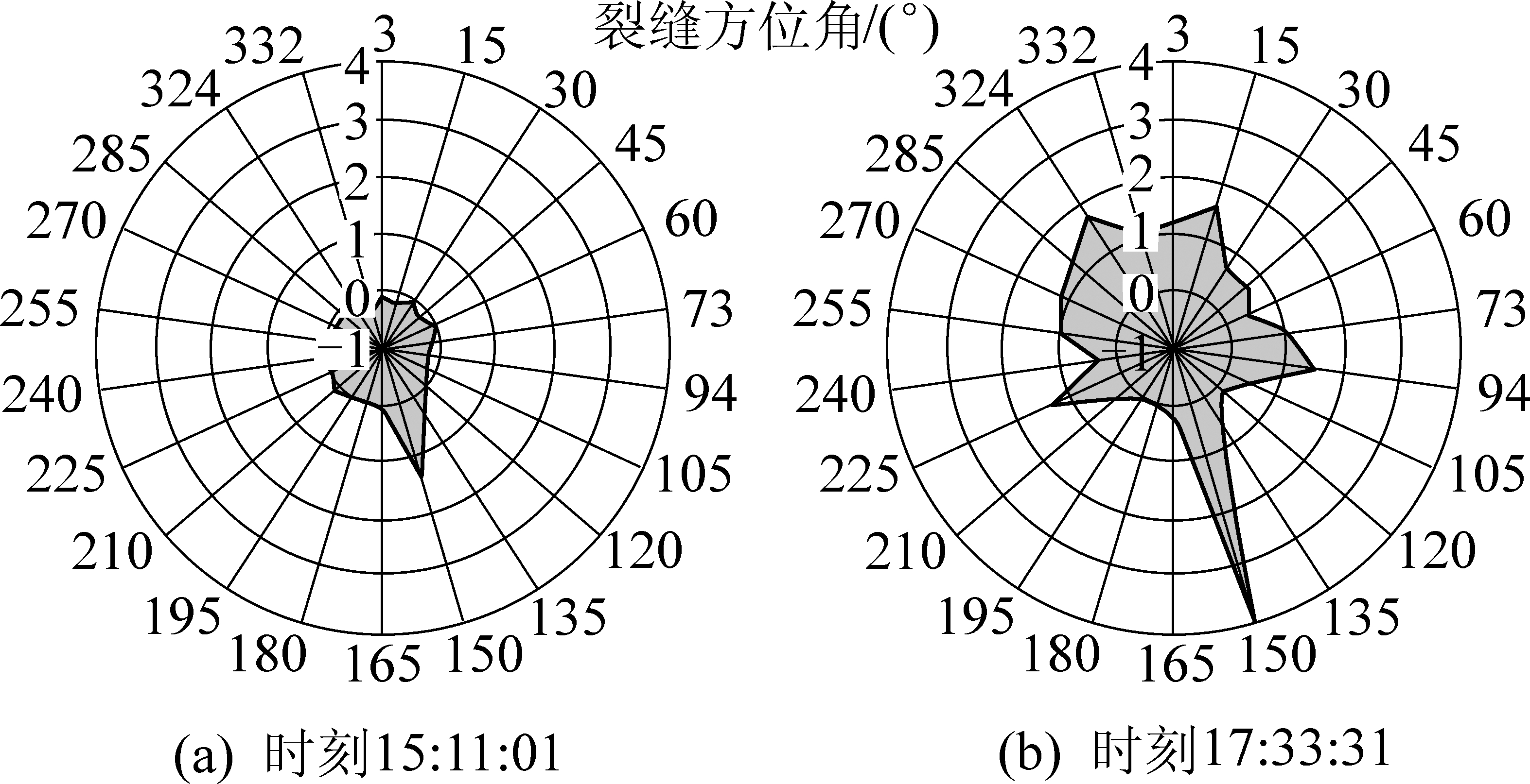 9煤层压裂裂缝监测自2018年7月15日9:39:24开始在150°方向形成主裂缝,该裂缝为单裂缝,缝长随压裂时间不断增加,在10:40:07时裂缝长度达到最长,经计算长度为51.3 m,随后此主裂缝不再发育;随着压裂不断进行,在0°~105°方向、200°~332°方向形成区域裂缝,11:30:42区域裂缝在15°、94°、225°、315°方向达到峰值。裂缝发育情况和测试曲线如图2所示。