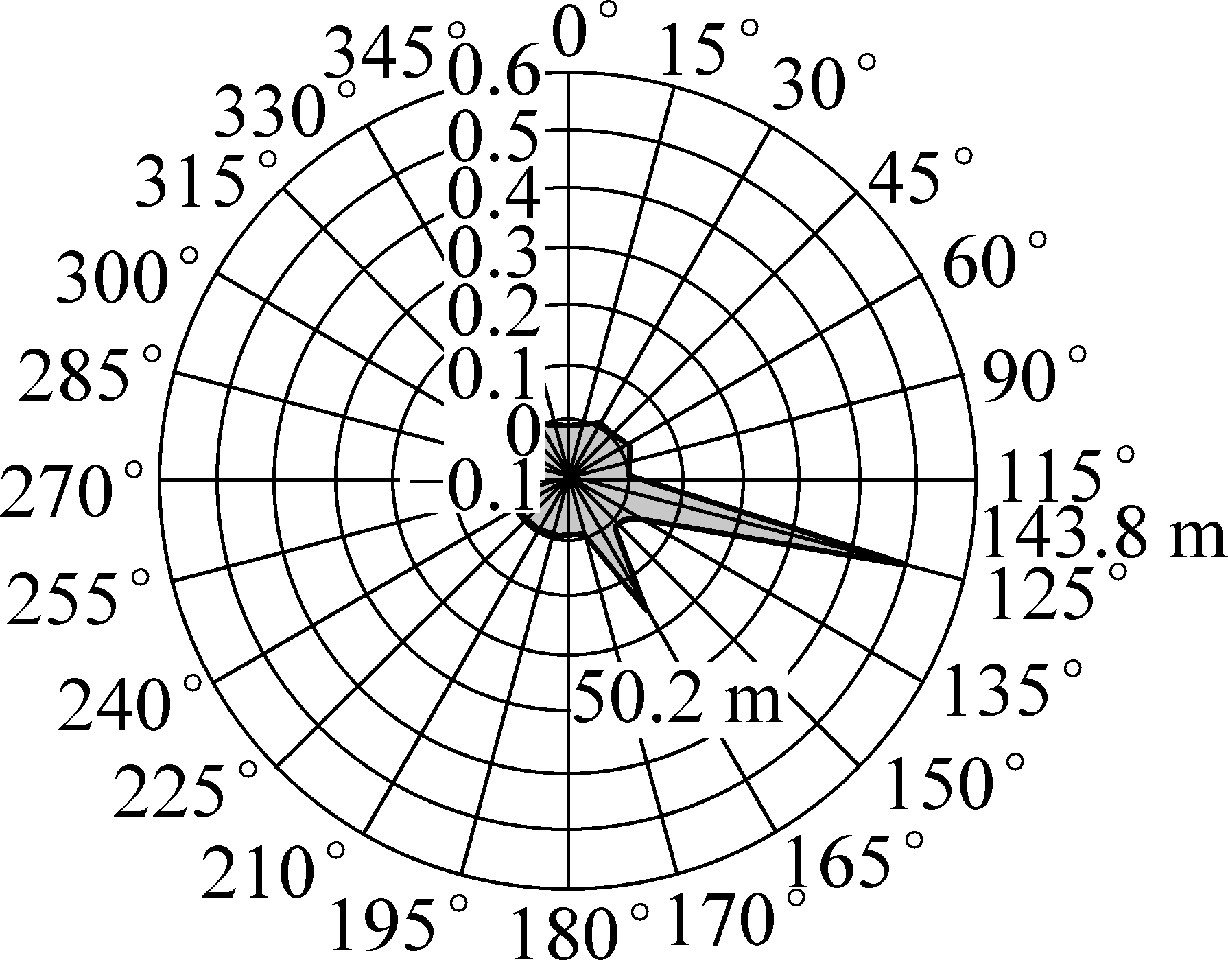 在韩城区块韩3-1-003A向1井应用与金试3向1井相同压裂工艺和施工参数条件,裂缝监测分析显示压裂开始在125°和165°方向形成主裂缝,2条裂缝均为单裂缝;缝长随压裂时间不断增加,在前置液末期时裂缝长度达到最长,经计算长度分别为143.8、50.2 m,随后此主裂缝不再发育。裂缝发育如图6所示。