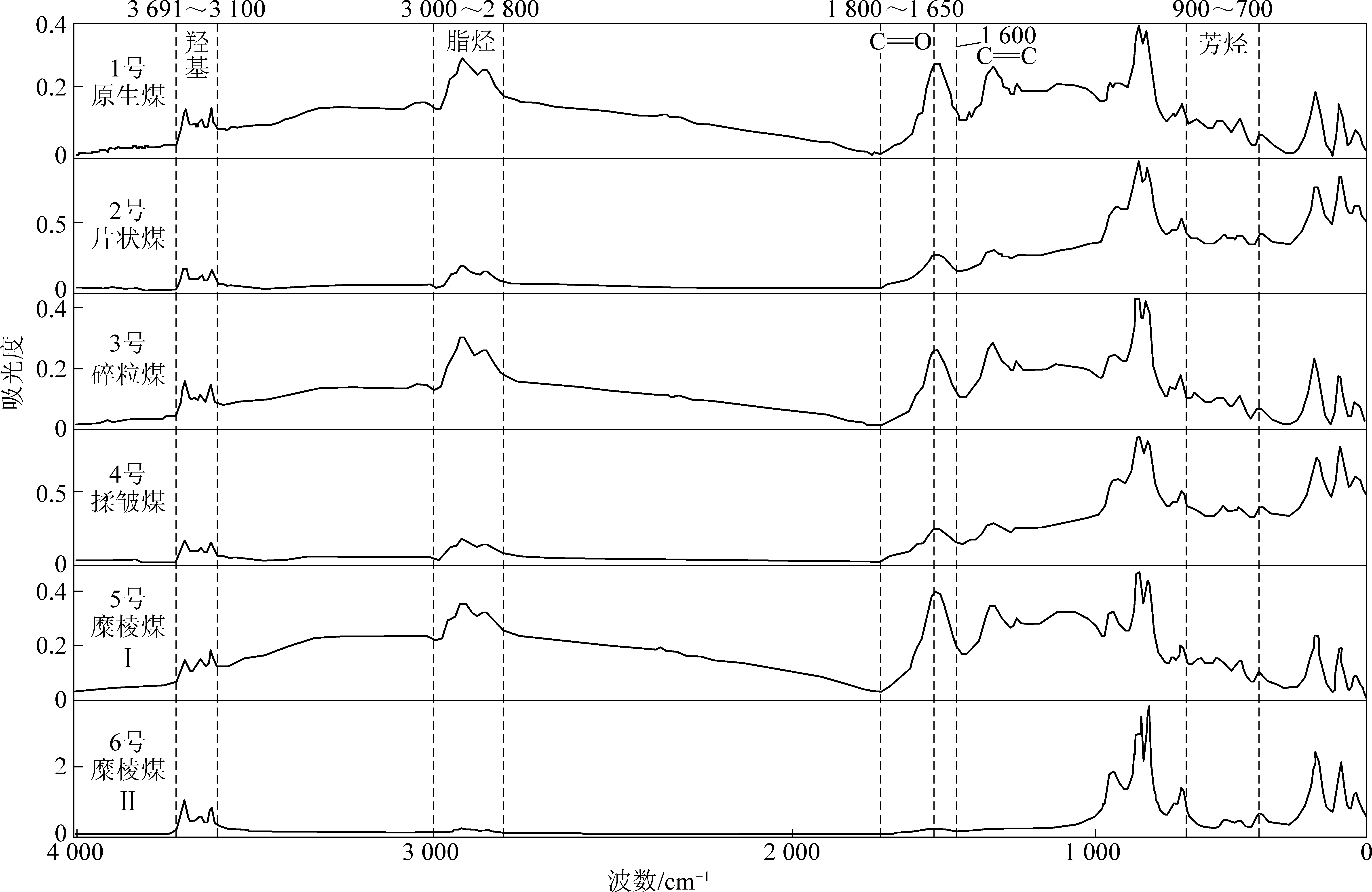 Fig.2 Infrared spectral characteristics of tectonically deformed coal